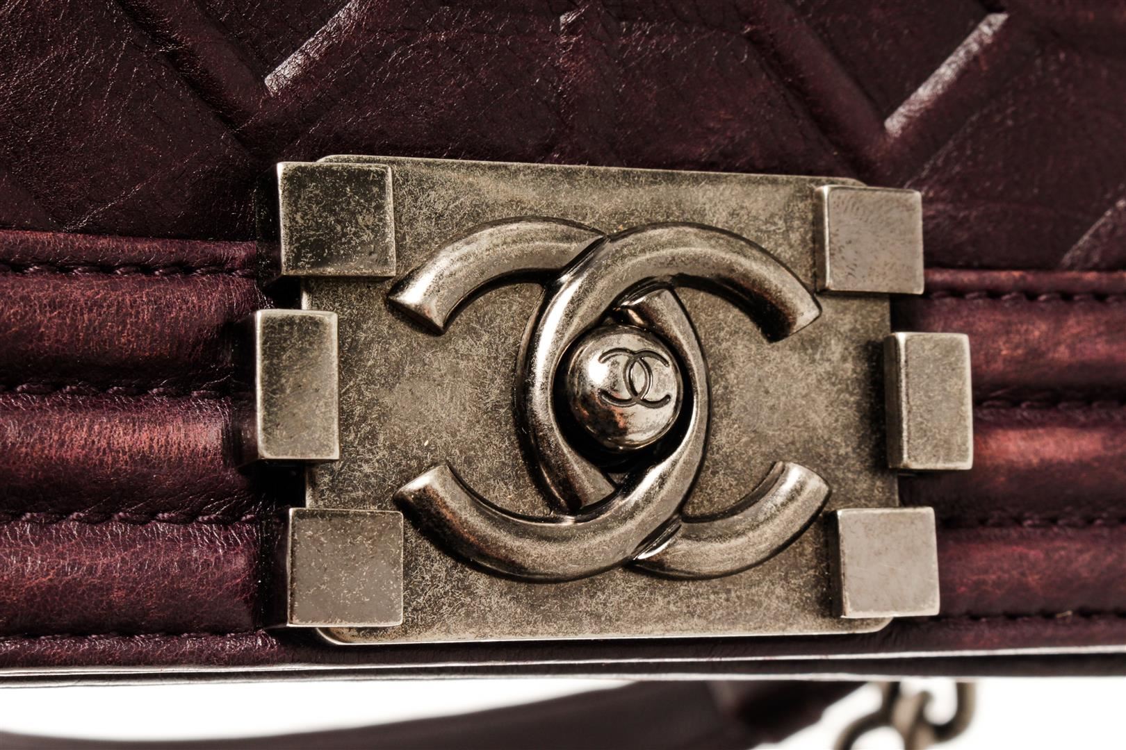 One Chanel Dark Purple Embossed Calfskin Boy Medium Flap Bag. Item is sold AS-IS. All available information is listed in the description and shown in the photo. Chanel Dark Purple Embossed Calfskin Boy Small Flap Bag with aged silver-tone hardware, grey canvas lining, interior zip pocket, chain leather shoulder strap, and flap closure with CC push lock. .