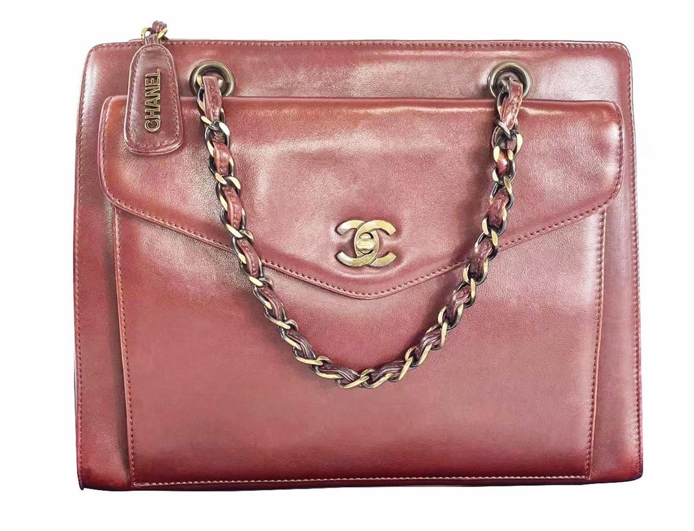 One Chanel Dark Red Leather Vintage Bordeaux Tote Bag. Item is sold AS-IS. All available information is listed in the description and shown in the photo. Vintage Chanel Dark Red Leather Bordeaux Tote with antiqued gold- tone hardware. 12.2" x 9.8" x 3.9"/31cm x 25cm x 10cm