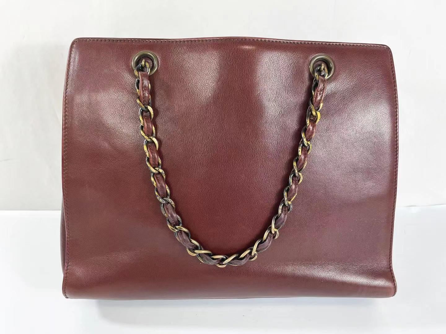 One Chanel Dark Red Leather Vintage Bordeaux Tote Bag. Item is sold AS-IS. All available information is listed in the description and shown in the photo. Vintage Chanel Dark Red Leather Bordeaux Tote with antiqued gold- tone hardware. 12.2" x 9.8" x 3.9"/31cm x 25cm x 10cm