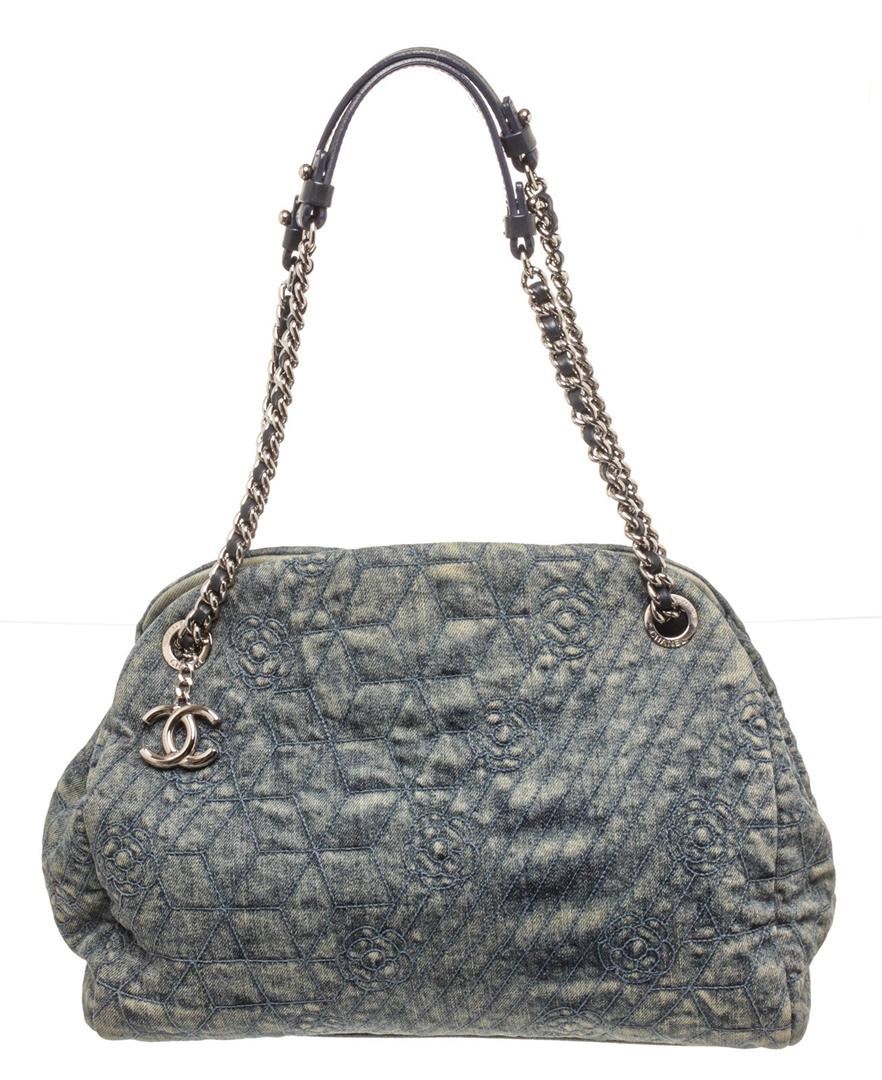 Chanel Denim Camelia Large Shoulder Bag with material fabric, silver-tone hardware, interior slip pocket, chain shoulder strap and flap closure.