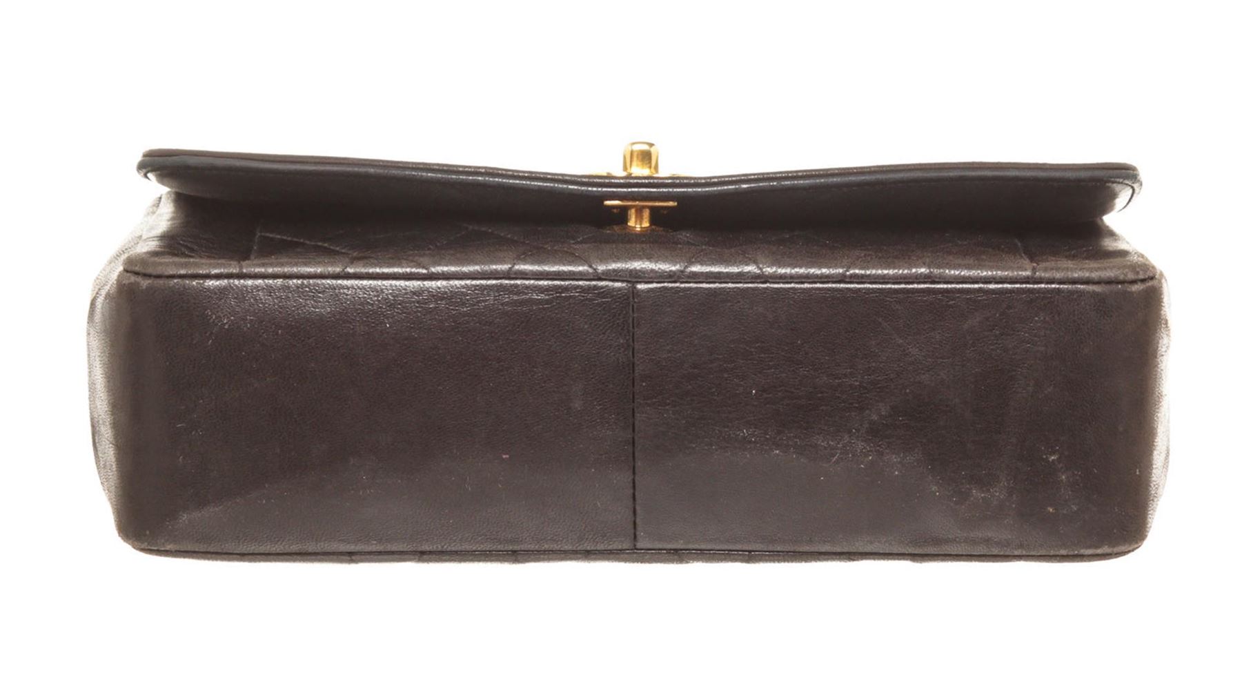 Chanel Diana Flap Bag Shoulder Bag. Brand: Chanel, Style: Diana Flap Bag, Type: Shoulder Bag, Exterior color: Black, Exterior material: Lambskin, Interior color: Red, Interior material: Lambskin, Length: 10, Width: 3, Height: 6. Item is sold AS-IS and all