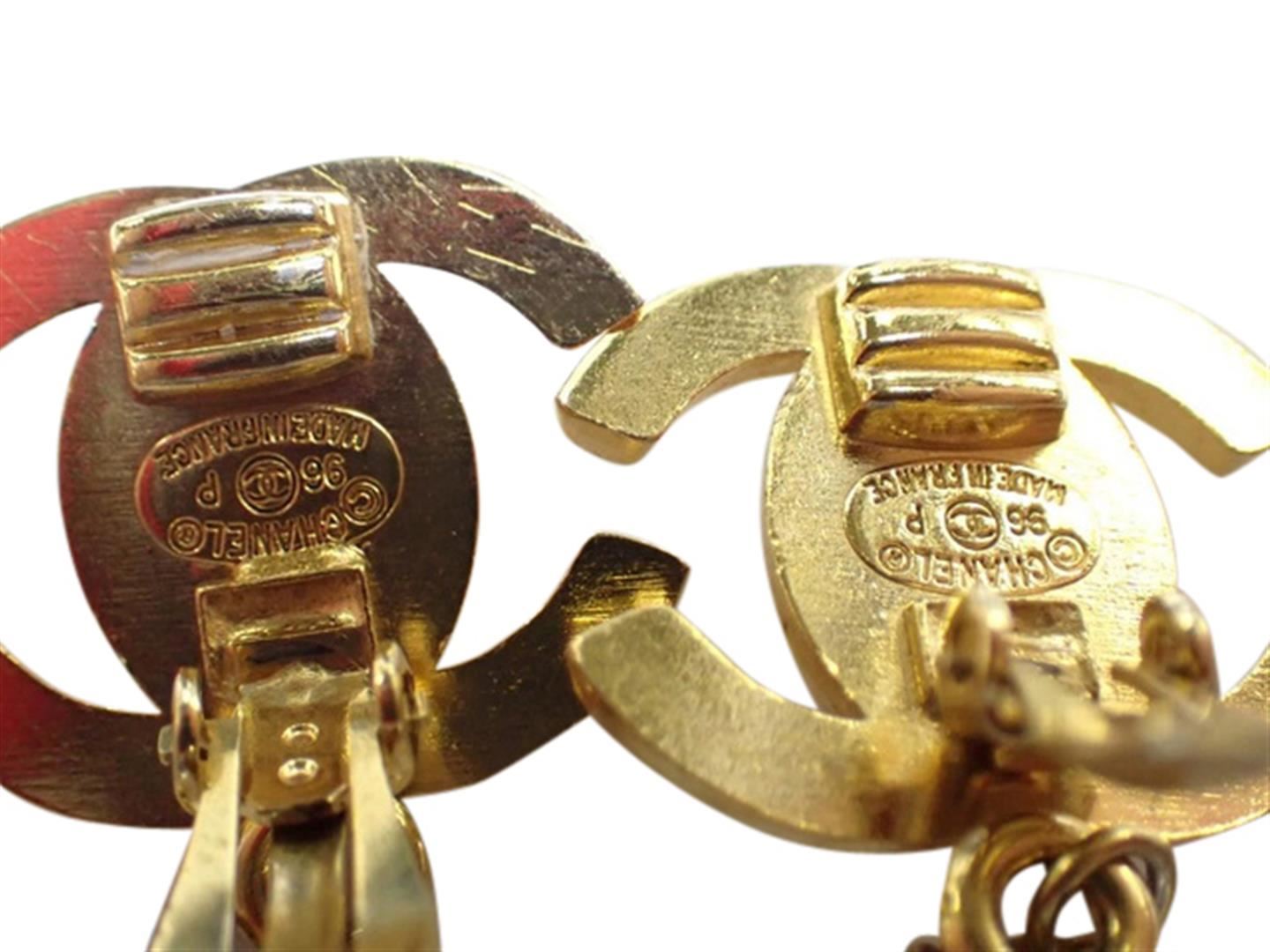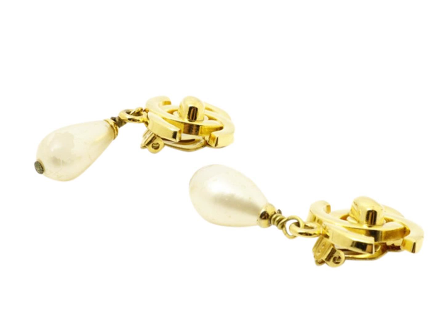 One Chanel Earrings. Item is sold AS-IS. All available information is listed in the description and shown in the photo. Interlocking CC turn-lock Chanel Earrings. Crafted from polished gold-plated brass, with a faux-pearl embellishment.