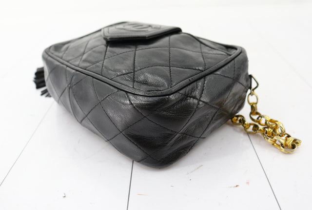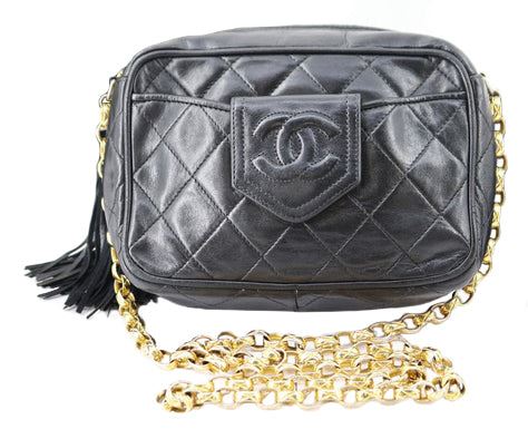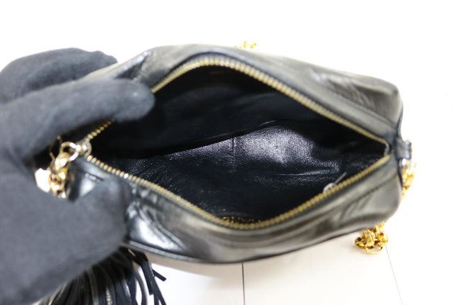 Chanel Fringe Camera Bag Shoulder Bag. Brand: Chanel, Style: Fringe Camera Bag, Type: Shoulder Bag, Exterior color: Black, Exterior material: Lambskin, Interior color: Black, Interior material: Leather, Length: 9, Width: 2.5, Height: 7. Item is sold AS-IS