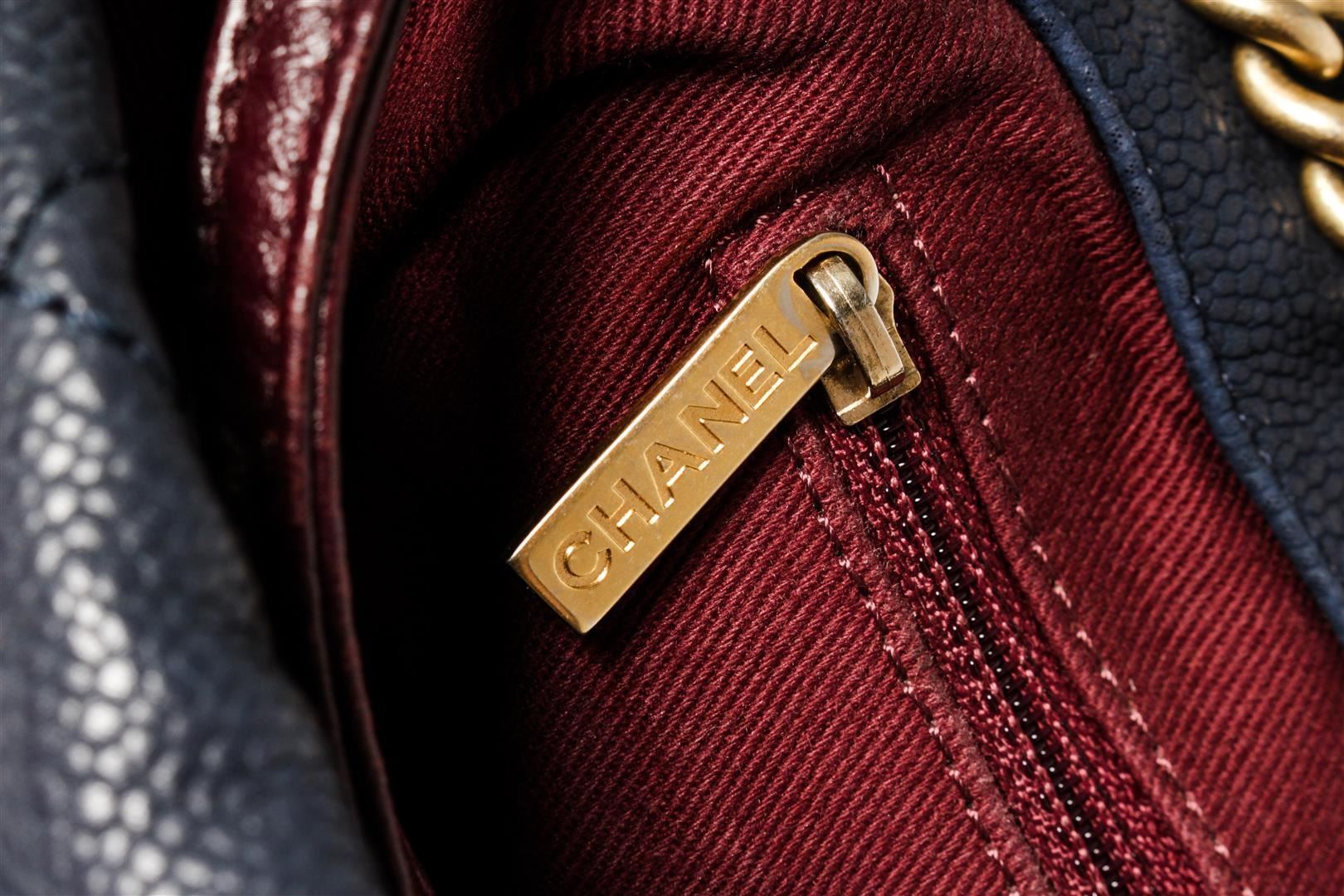 One Chanel Globetrotter Drawstring. Item is sold AS-IS. All available information is listed in the description and shown in the photo. Chanel Globetrotter Drawstring Blue Caviarskin. Features gold hardware, blue leather handles, red canvas interior, and a gold button closure.