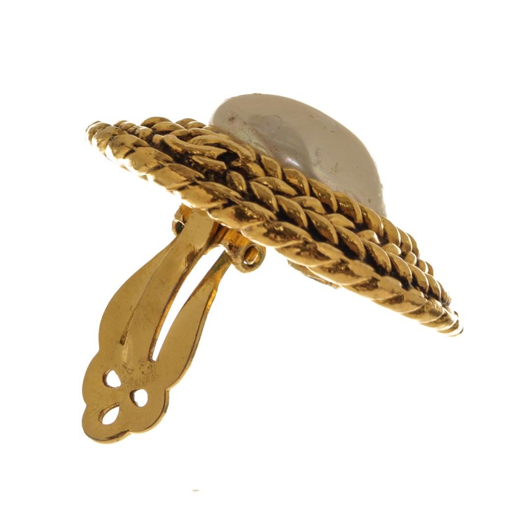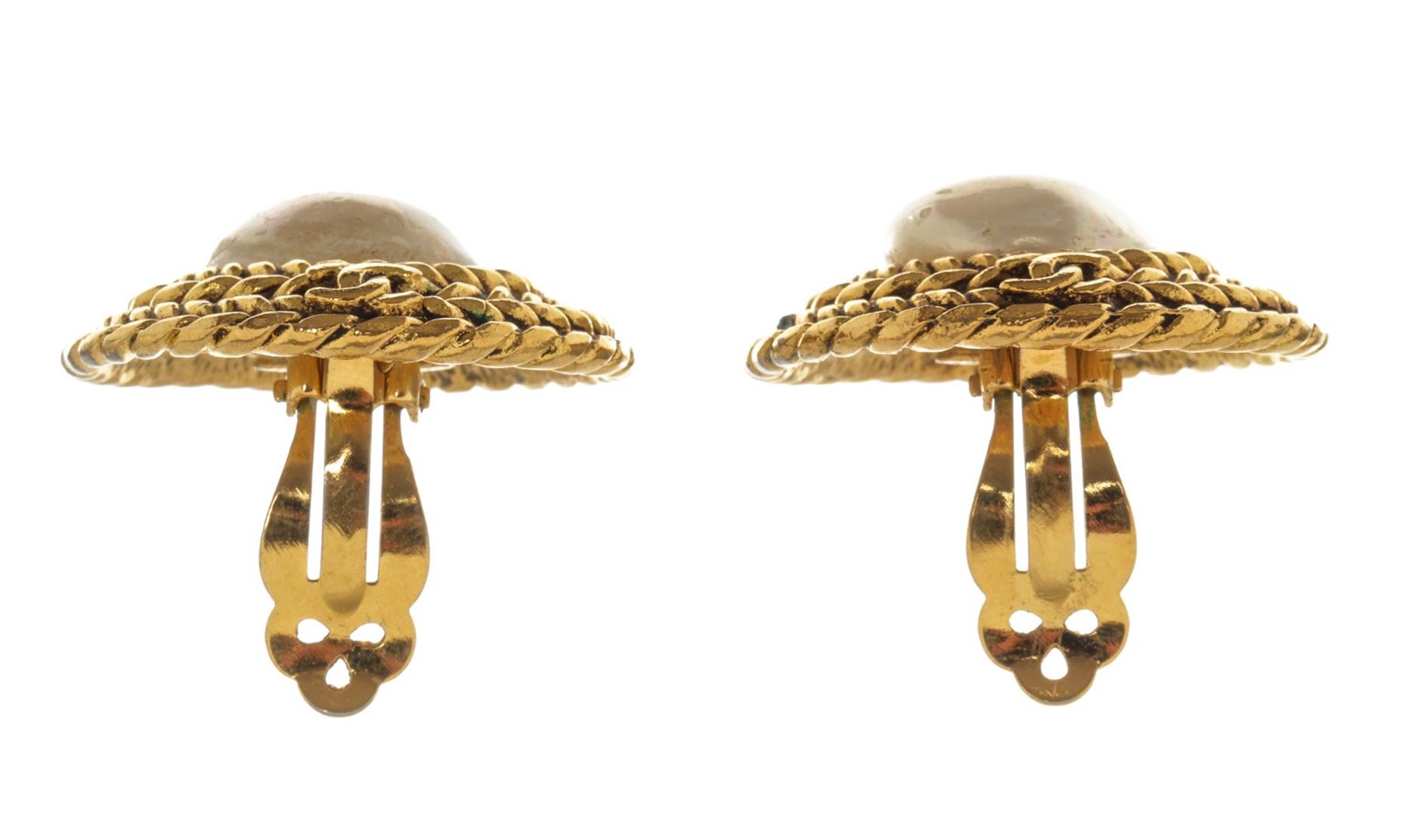 Chanel Gold CC Pearl Braided Disc Earrings. All available information is listed in the description and shown in the photos. Chanel Gold CC Pearl Braided Disc Earrings with gold tone metal hardware, and faux pearls.