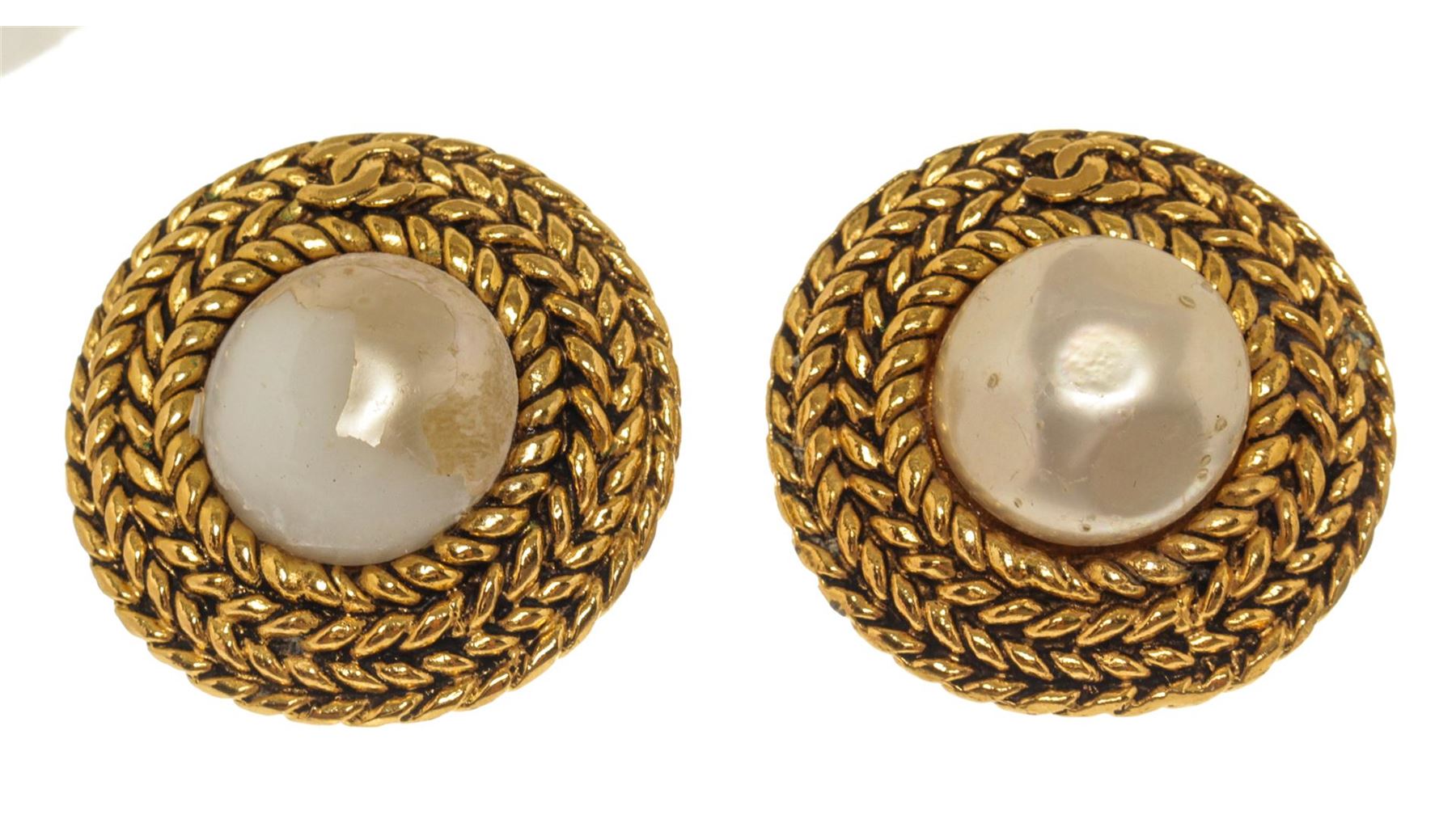 Chanel Gold CC Pearl Braided Disc Earrings. All available information is listed in the description and shown in the photos. Chanel Gold CC Pearl Braided Disc Earrings with gold tone metal hardware, and faux pearls.