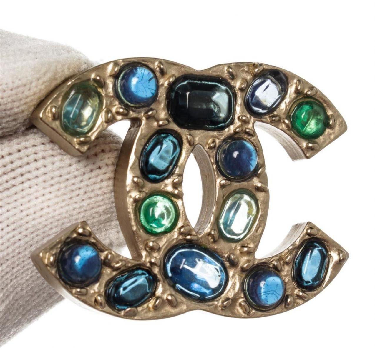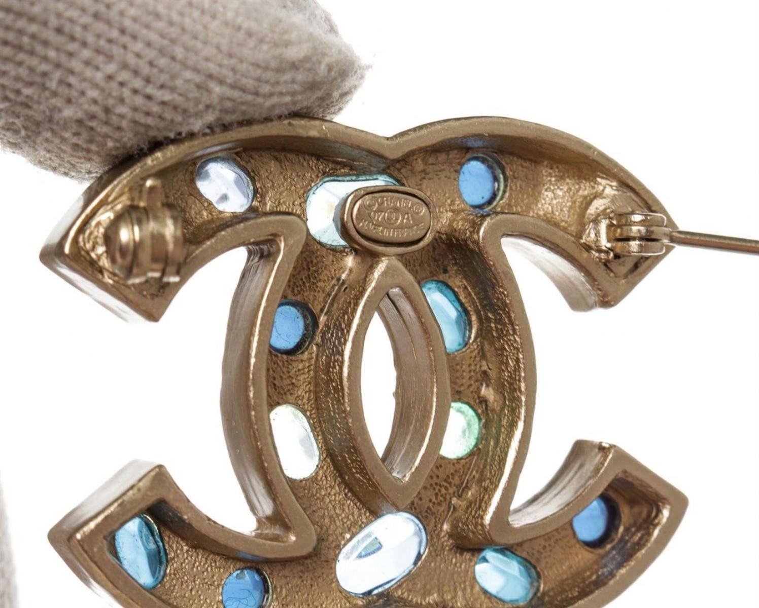 Gold-tone Chanel pin shape brooch with rhinestones on CC logo and gold-tone hardware.