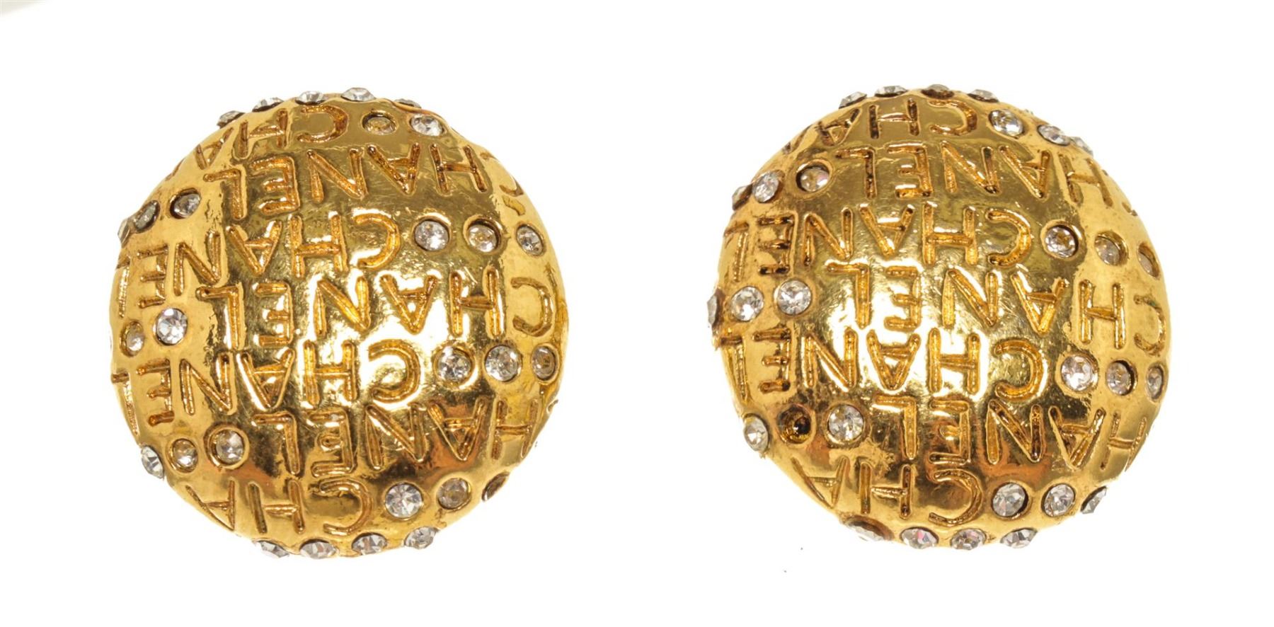 Chanel Gold CC Rhinestone Clip On Earrings. All available information is listed in the description and shown in the photos. Chanel Gold CC Rhinestone Clip On Earrings with gold tone metal hardware, rhinestones, and clip one closure.