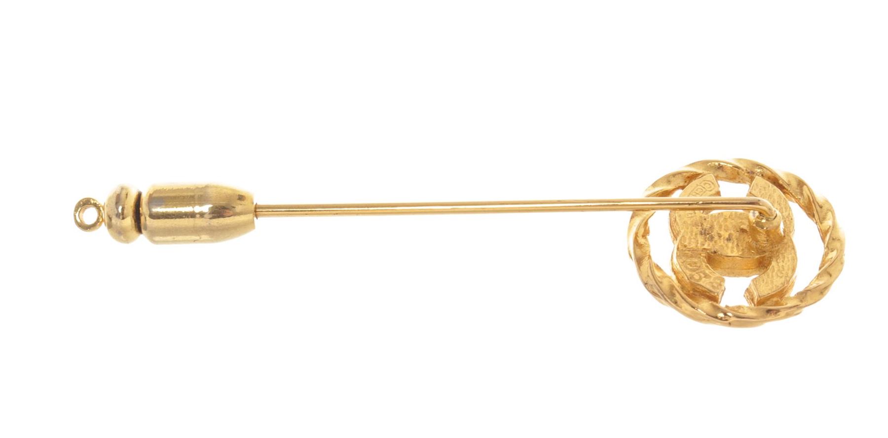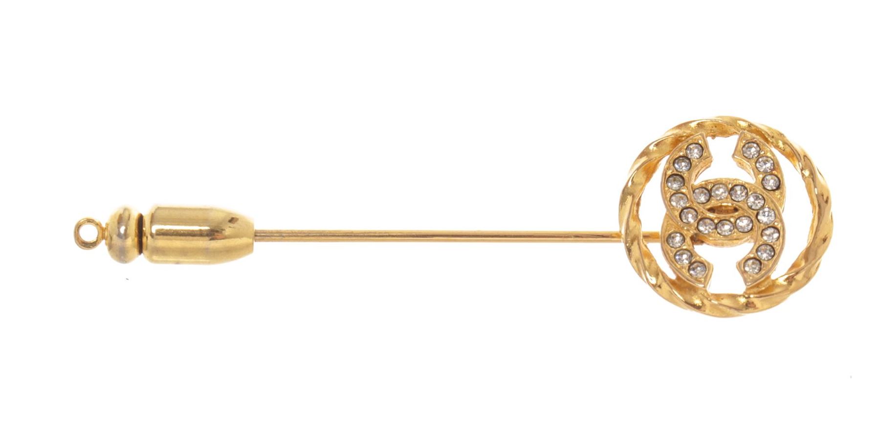 Chanel Gold CC Rhinestone Pin Brooch. All available information is listed in the description and shown in the photos. Chanel Gold CC Rhinestone Pin Brooch with cc logo with rhinestones all over with a single pin, gold-tone hardware.