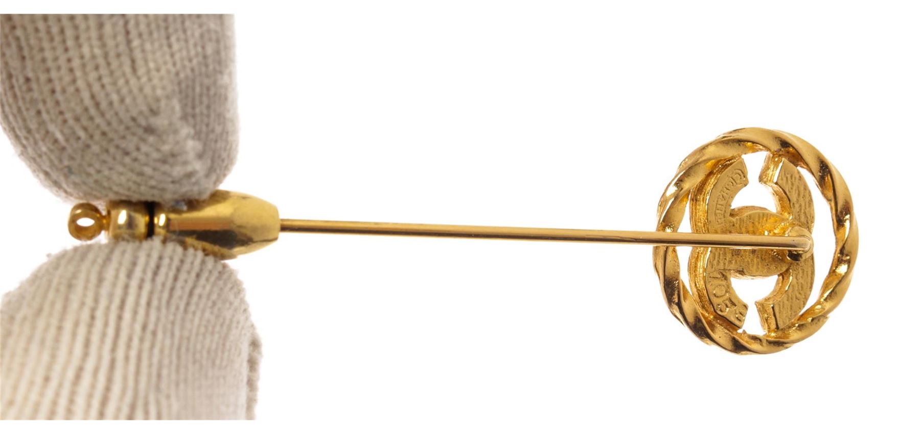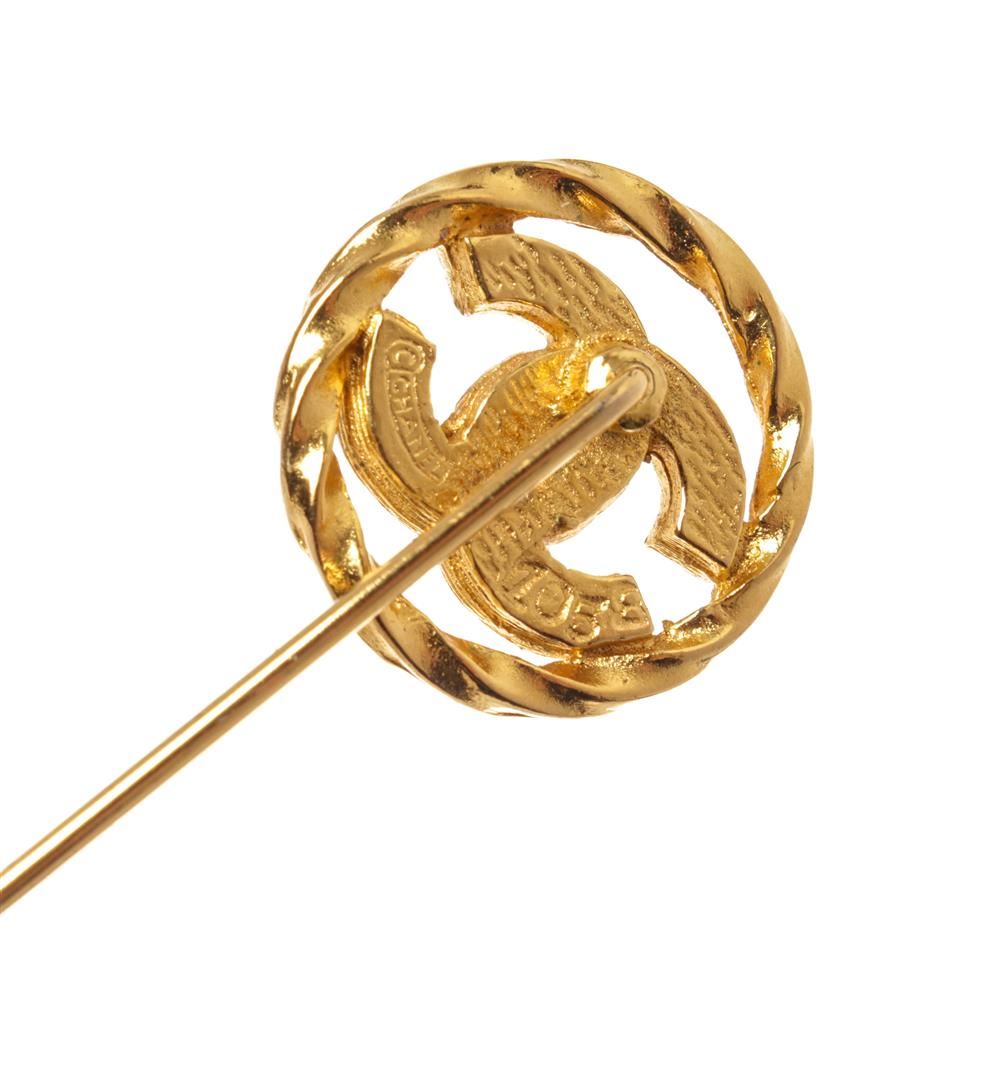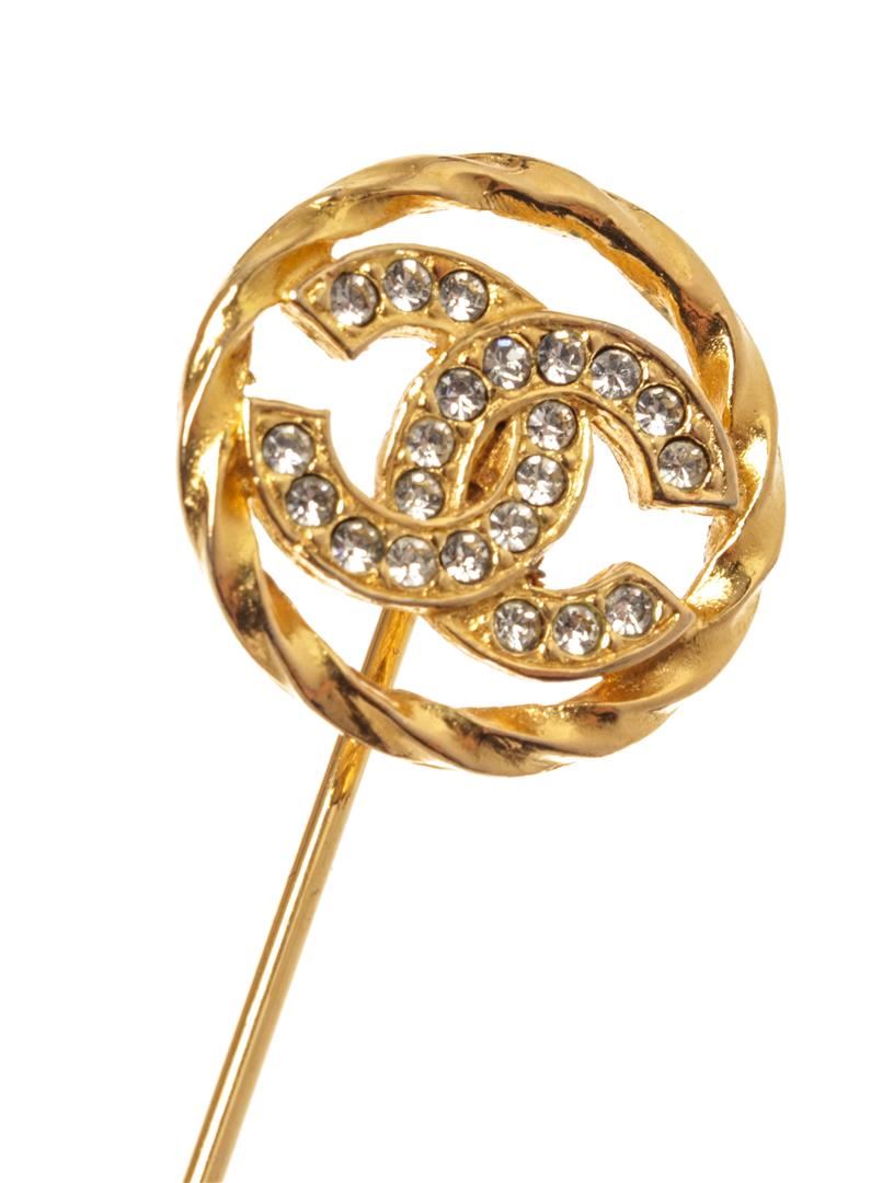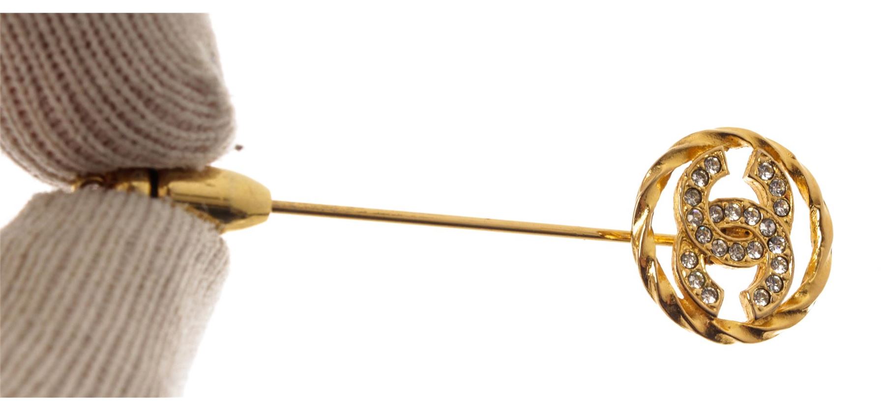 Chanel Gold CC Rhinestone Pin Brooch. All available information is listed in the description and shown in the photos. Chanel Gold CC Rhinestone Pin Brooch with cc logo with rhinestones all over with a single pin, gold-tone hardware.
