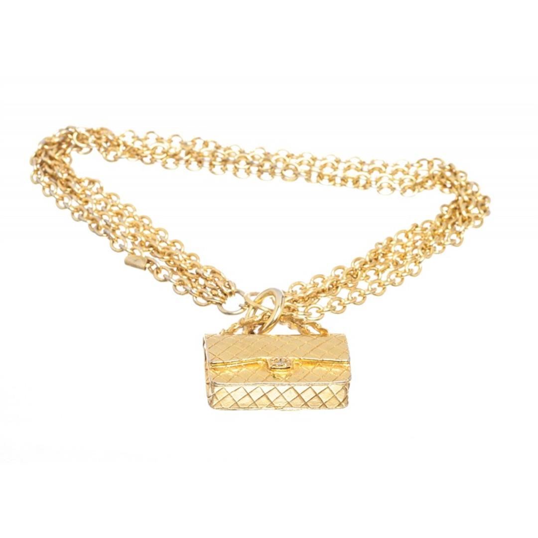 Chanel gold chain link quilted flap bag charm pendant long necklace. Overall clasp closure with removable pendant. Item is pre-owned.