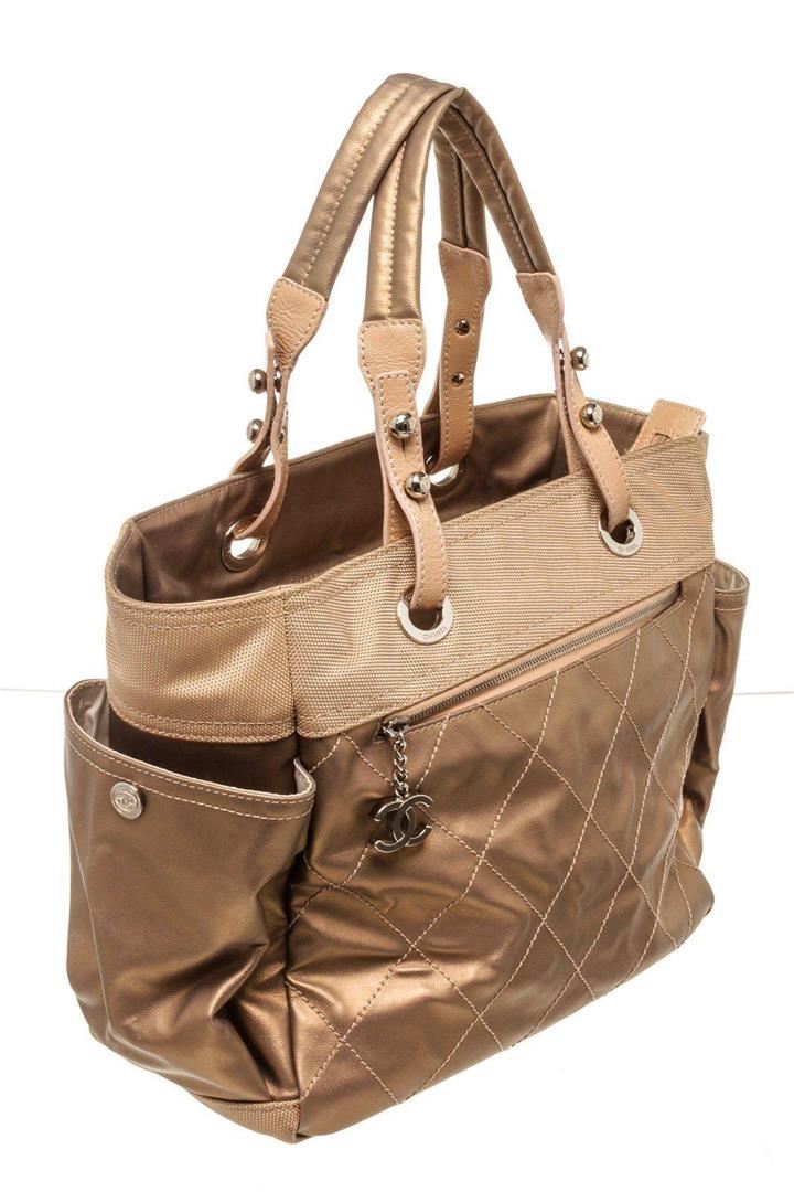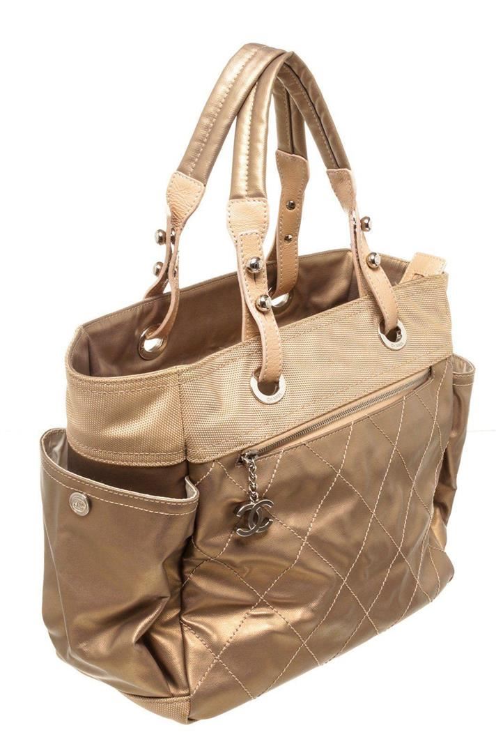 Chanel Gold Coated Canvas Paris Biarritz Lar Tote Bag with material coated canvas, gold-tone hardware, exterior slip pocket, interior zip pocket, and zipper closure.