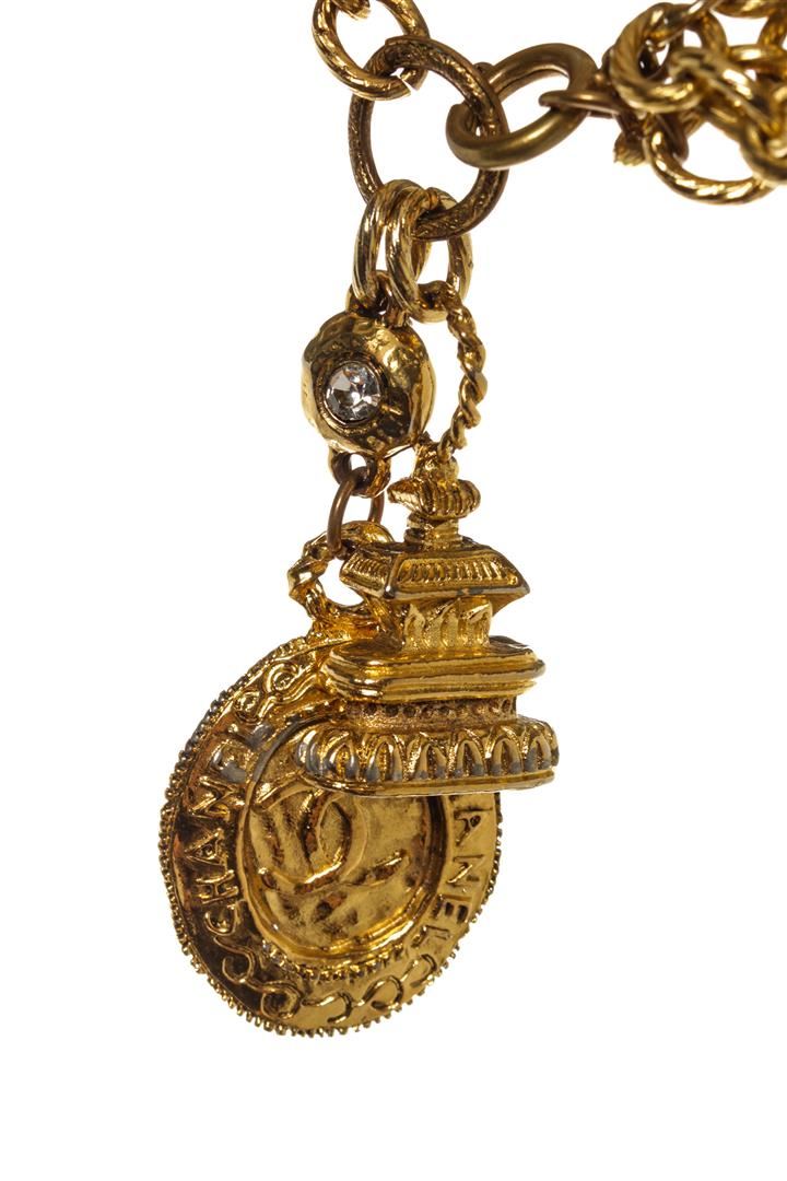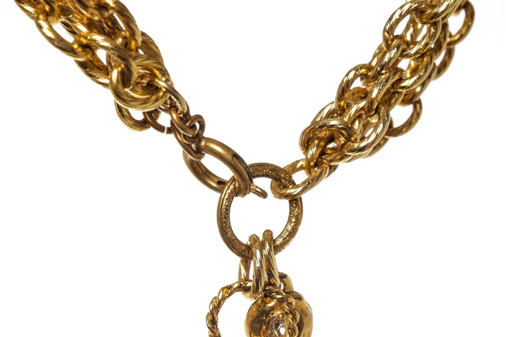 One Chanel Gold Coco Mark Two Pendants Multi-Strand Necklace. Item is sold AS-IS. All available information is listed in the description and shown in the photo. Chanel Gold Coco Mark Two Pendants Multi-Strand Necklace with gold tone metal hardware and pendants, two pendants, a clear rhinestone accent. Made in France.