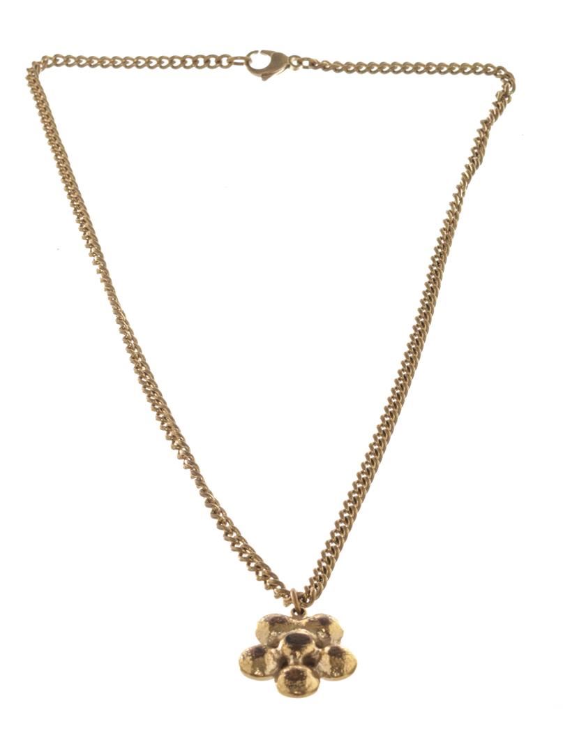Chanel Gold Flower Necklace. All available information is listed in the description and shown in the photos. Chanel Gold Flower Necklace with gold tone hardware, flower pendant with CC logo with rhinestones.
