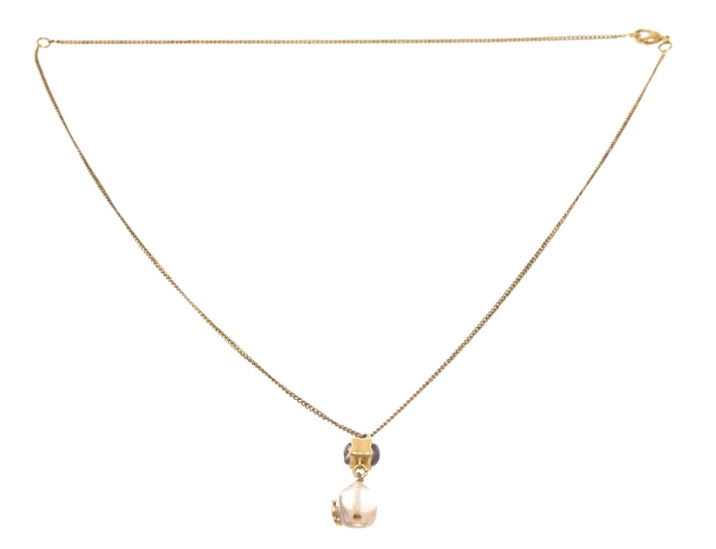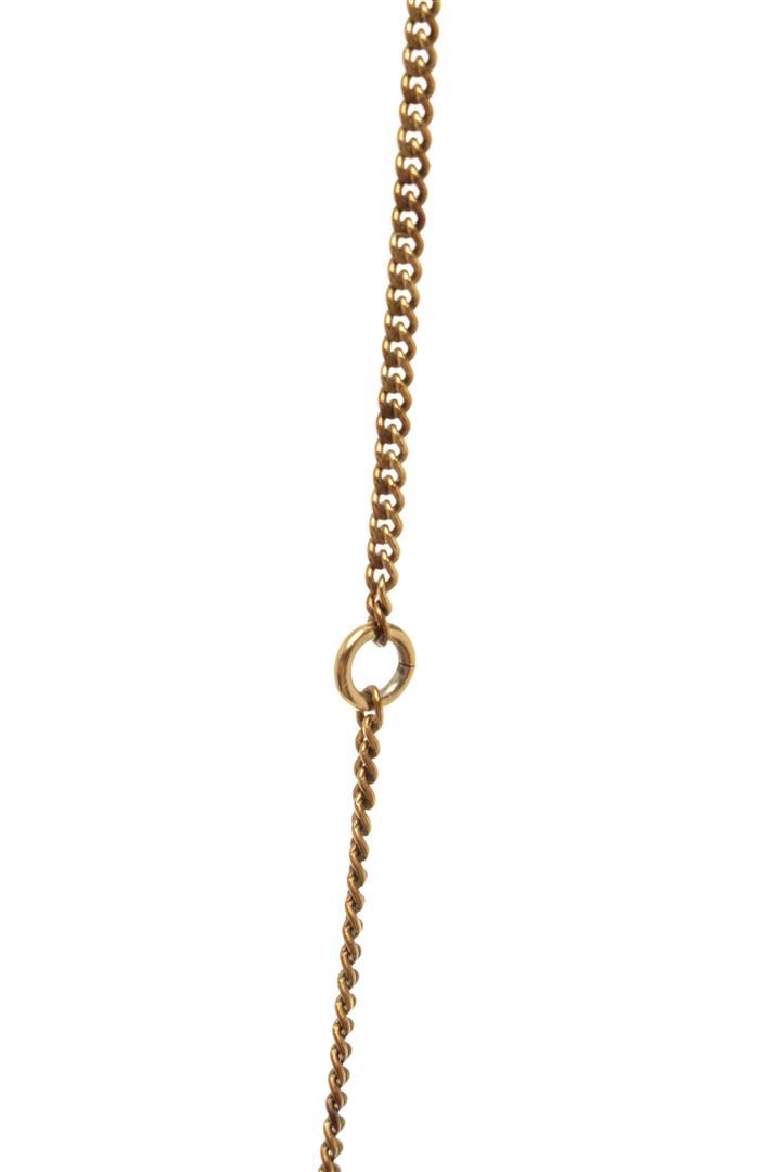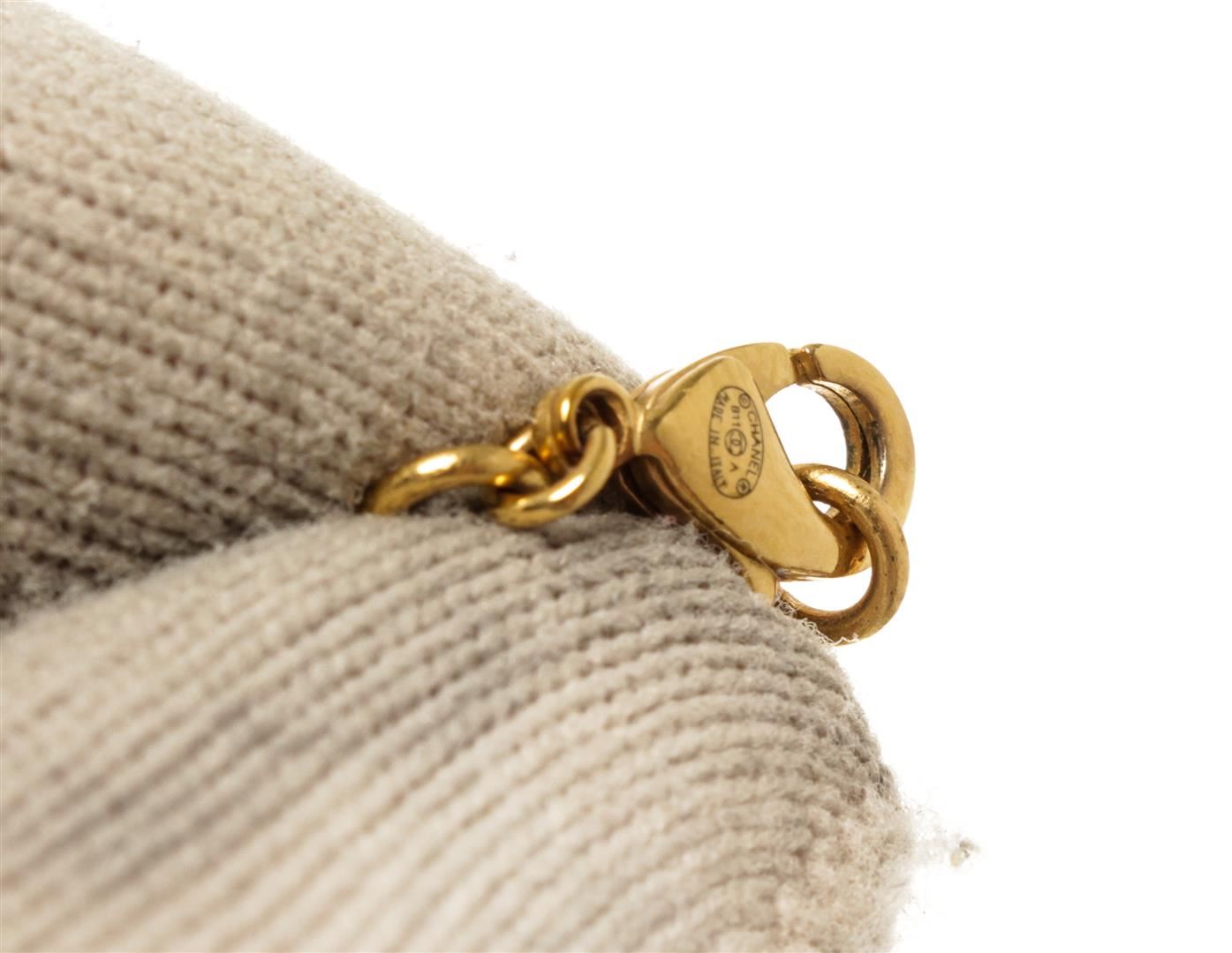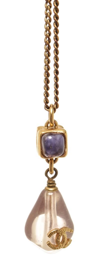 Chanel Gold Gem Long Necklace. All available information is listed in the description and shown in the photos. Chanel gold gem long necklace with gold-tone chain, lobster claw closure, and a clear pink gem pendant with a CC logo dangling.