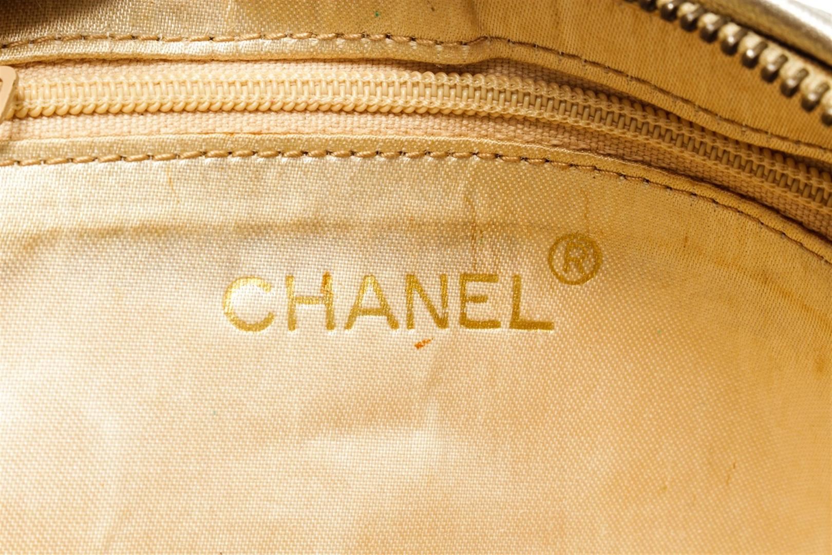 One Chanel Gold Leather Pouch with Tassel. Item is sold AS-IS. All available information is listed in the description and shown in the photo. Chanel gold leather pouch with tassel features soft metallic gold leather that is quilted in the signature Chanel diamond pattern exterior, gold-tone hardware, zip closure with an oversized Gripoix glass jeweled tassel, and beige satin lining. There are some wear on the canvas lining near the zipper, some discoloration on the canvas, cracking on the silver leather as well as discoloration. Please refer to photos! Height: 3" Width: 11" Depth: 3", Shoulder Drop: / 7.62 x 7.62 x 22.86 Cm