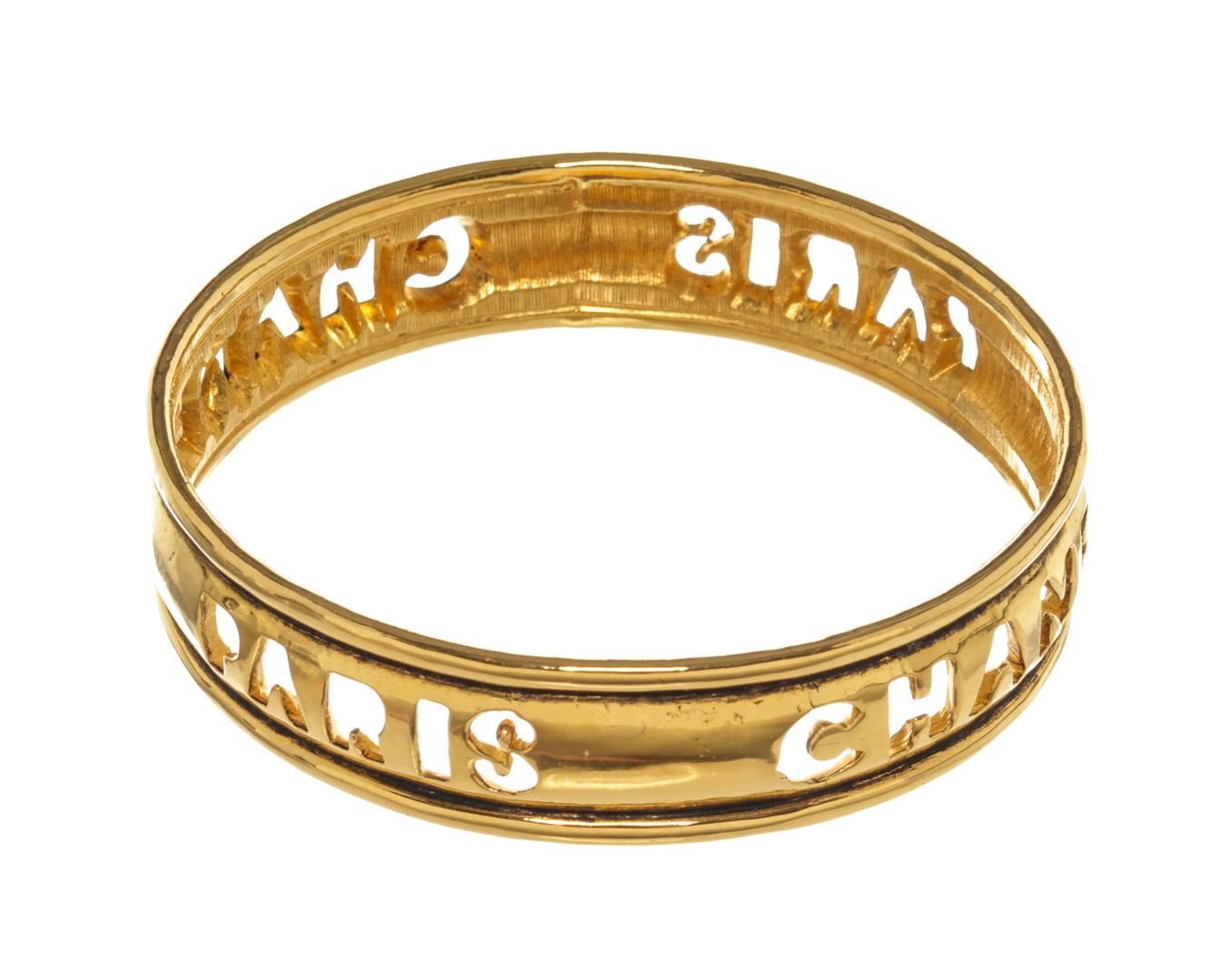 Chanel Gold Metal Cut Out Logo Bangle Bracelet. All available information is listed in the description and shown in the photos. Chanel Gold Metal Cut Out Logo Bangle Bracelet with a Circumference of 8.75"