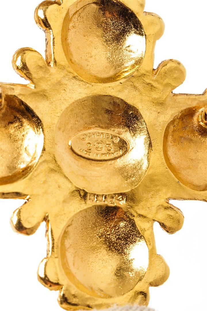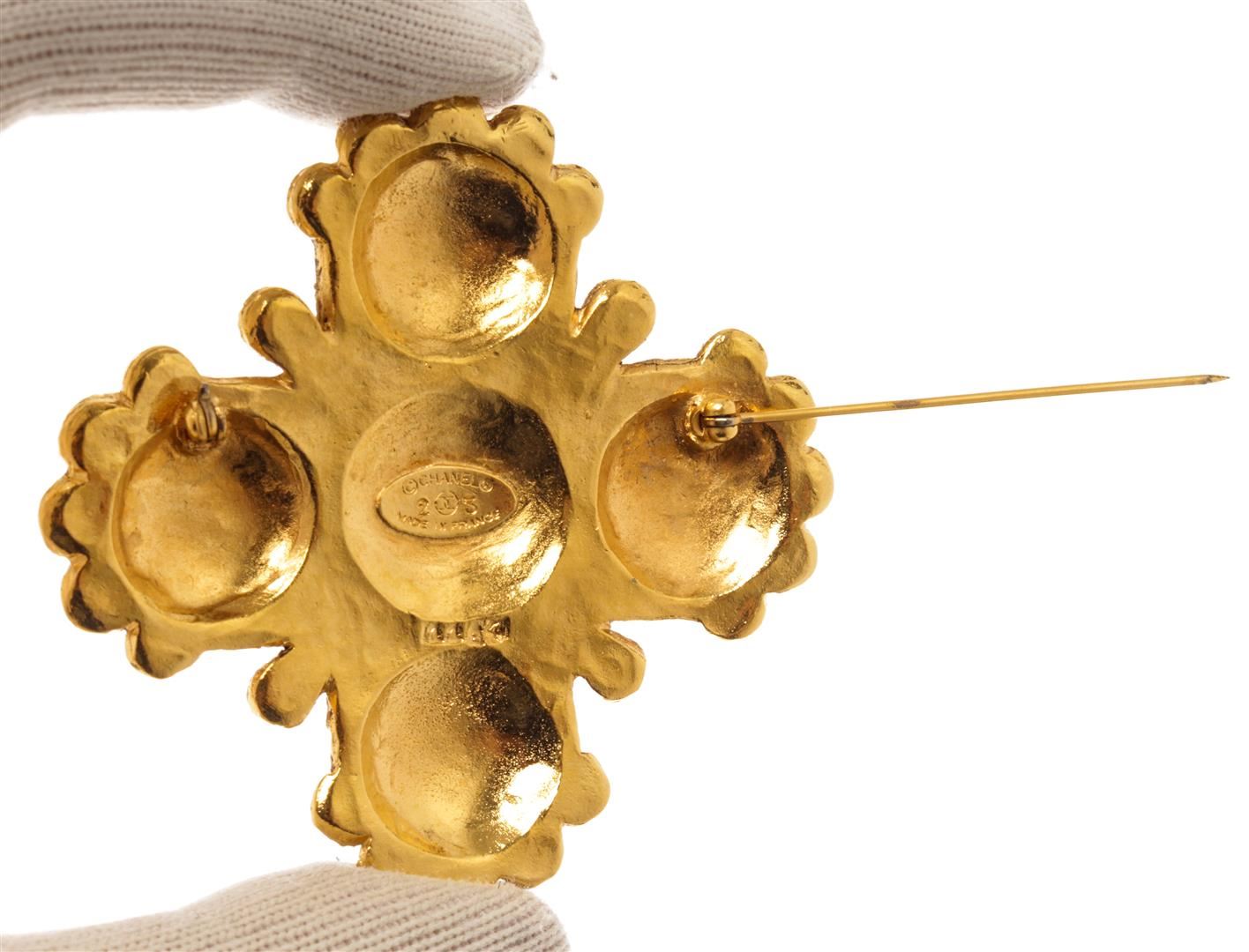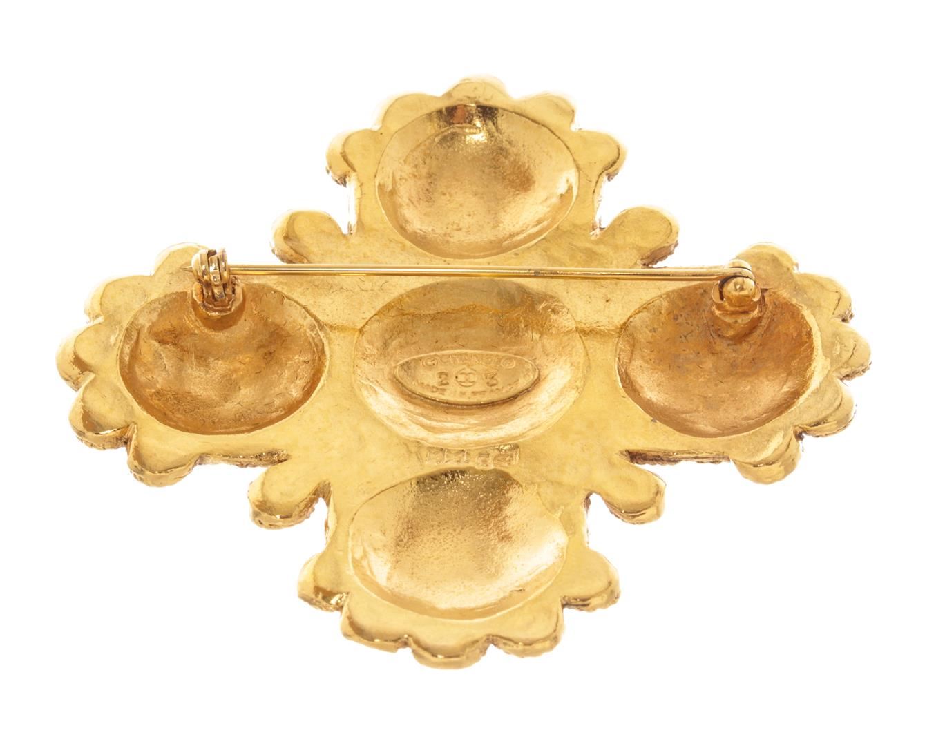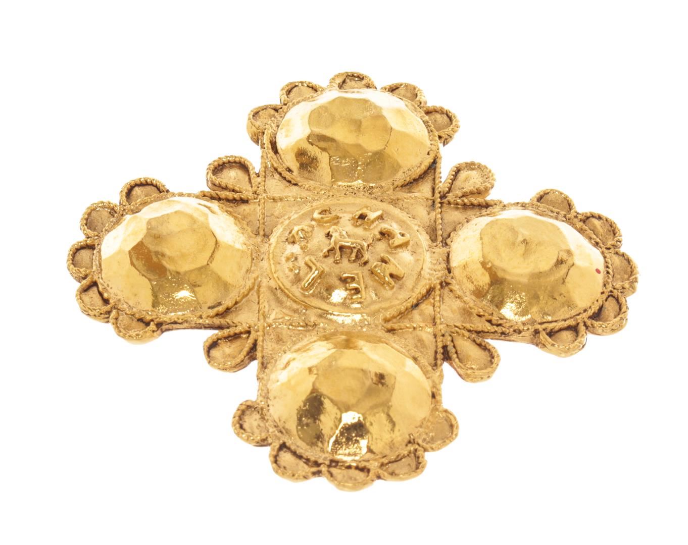 Chanel Gold Metal Lion Cross Brooch. All available information is listed in the description and shown in the photos. Chanel Gold Metal Lion Cross Brooch with featuring a a central logo detail, gold-tone hardware, fold over clip-on backs, 24kt gold electroplated finish, cross shape with scalloped pattern around edges, pin closure on back. Width: 2.25" Length: 2.25"/ 5.71 x 5.71 Cm