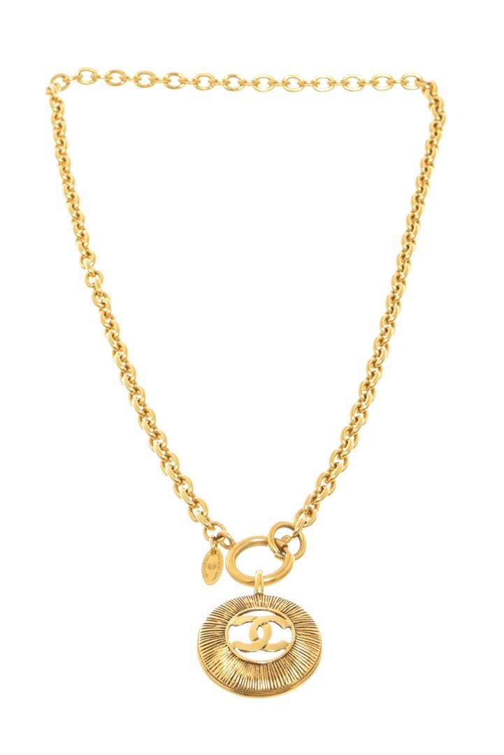 One Chanel Gold Metal Vintage CC Round Pendant Necklace. Item is sold AS-IS. All available information is listed in the description and shown in the photo. Chanel Gold Metal Vintage CC Round Pendant Necklace with exterior color gold, material metal. Length: 23 " / 58.42 Cm