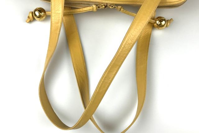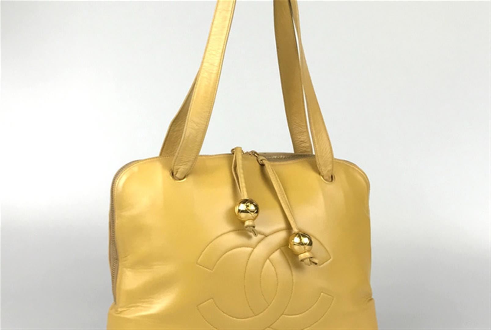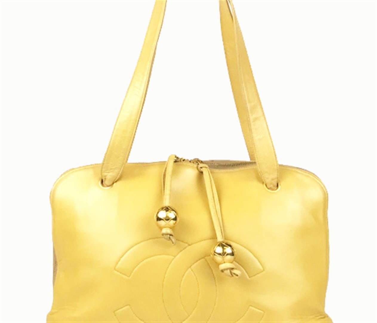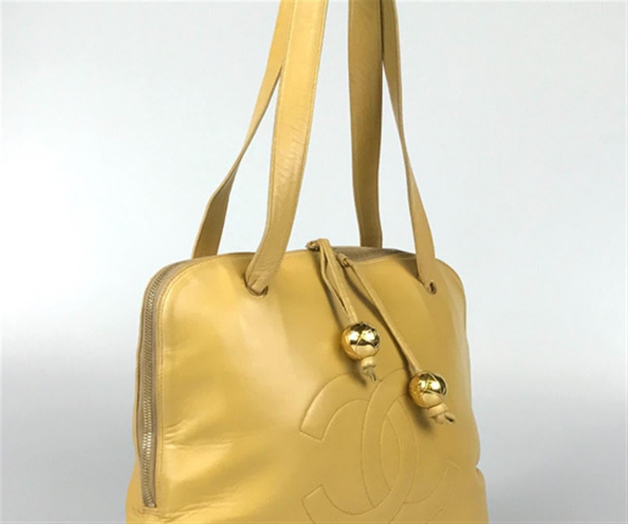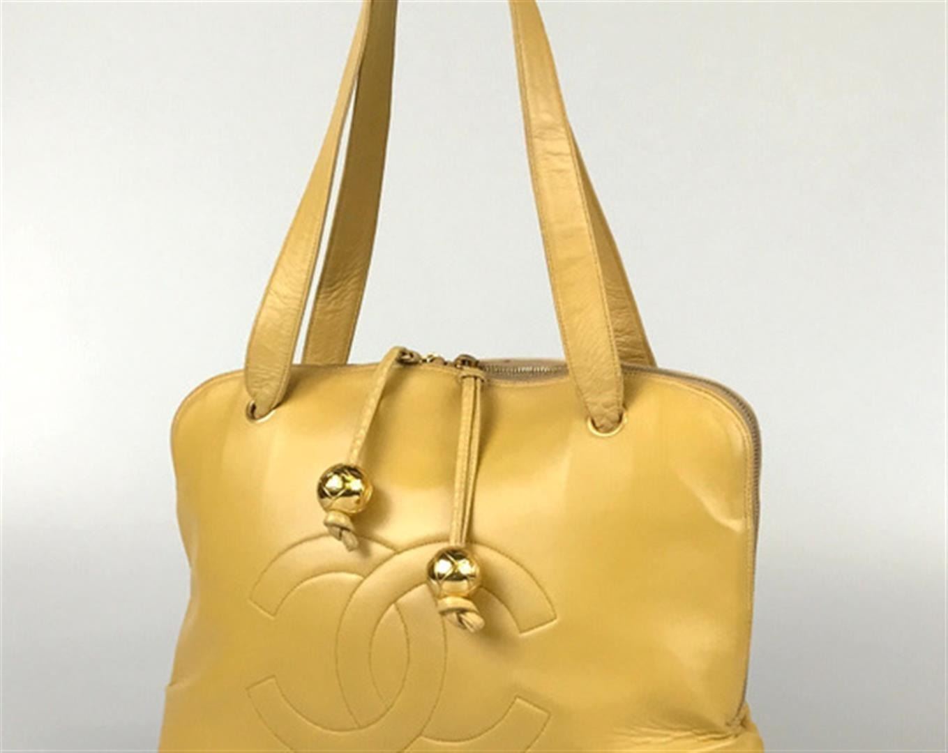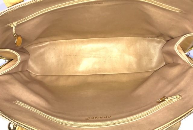 Vintage Chanel shoulder bag in gold metallic Lambskin leather. The Front has a large CC logo embosssed and stitched on. The top has a rounded shape with a double zipper closure that has 2 "quilted" gold ball charms. The inside has gold metallic leather li