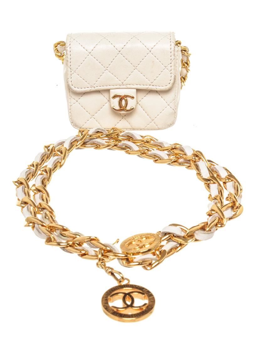 Chanel Gold Micro Mini Flap Bag Braided Belt. Please see photos and description for all available information! Chanel chain micro mini flap bag gold braided belt with CC logo pendant, gold-tone hardware and white micro mini flap bag.