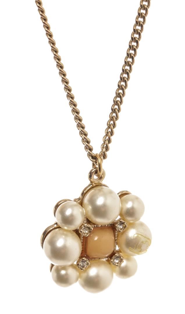 Chanel Gold Orange Pearl Pendant Necklace. All available information is listed in the description and shown in the photos. Chanel Gold Orange Pearl Pendant Necklace with gold-tone hardware, gold fine-link chain, gold orange pearl with stone.