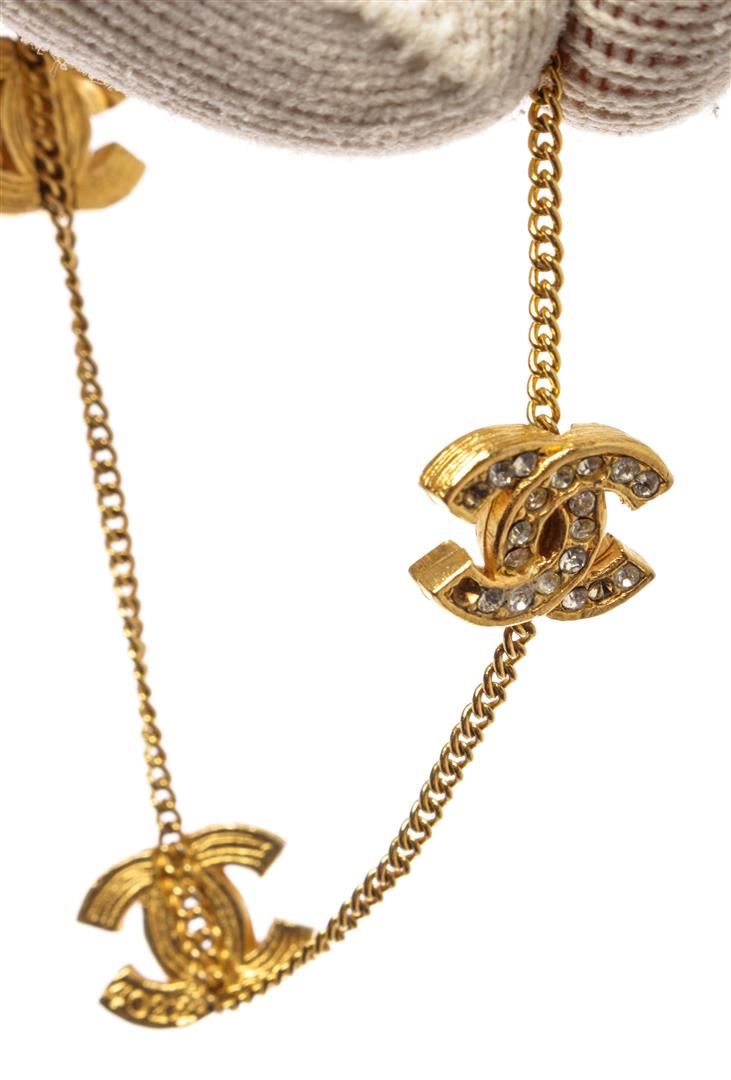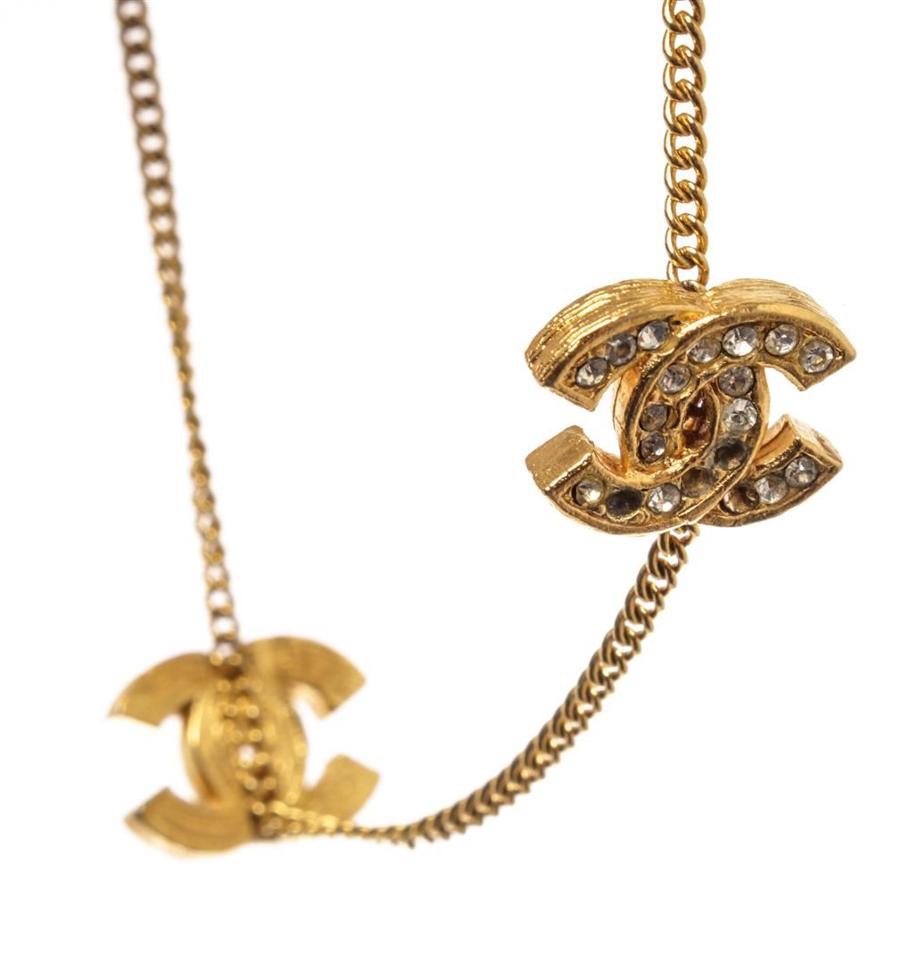 Chanel Gold Plated Brass CC Rhinestone Charm Bracelet. All available information is listed in the description and shown in the photos. Chanel Gold Plated Brass CC Rhinestone Charm Bracelet with this bracelet features a clasp fastening with a gold-plated brass chain with three chanel cc crystal lined logos that clasps loosely, finished with crystal-embellished cc logo charms, gold-tone hardware. Length when open: 7.3", Width: 0.6" / 18.5 x 1.4 cm