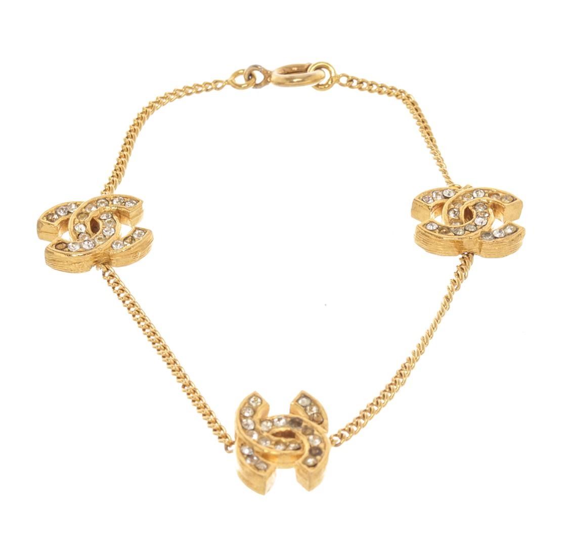 Chanel Gold Plated Brass CC Rhinestone Charm Bracelet. All available information is listed in the description and shown in the photos. Chanel Gold Plated Brass CC Rhinestone Charm Bracelet with this bracelet features a clasp fastening with a gold-plated brass chain with three chanel cc crystal lined logos that clasps loosely, finished with crystal-embellished cc logo charms, gold-tone hardware. Length when open: 7.3", Width: 0.6" / 18.5 x 1.4 cm