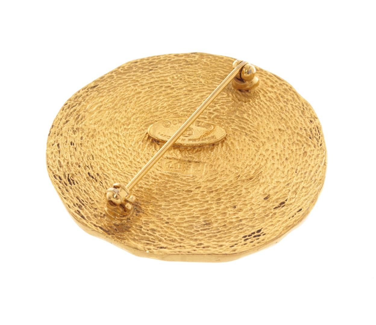 Chanel Gold Plated Rue Cambon Brooch. All available information is listed in the description and shown in the photos. Chanel Gold Plated Rue Cambon Brooch with enriched gold plated brass brooch in a round shape, embossed with iconic 3301 rue cambon paris logo, the brooch is stamped with an authenticity mark, the pin on the back is secure with excellent tension.