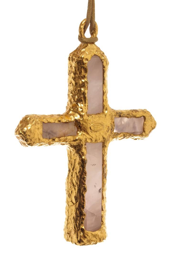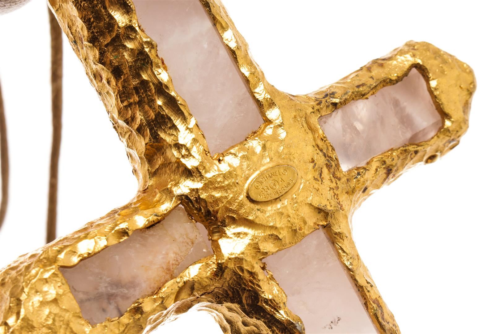 Chanel Gold Runway Rose Quartz & Gripoix Goosens Cross Pendant Necklace. All available information is listed in the description and shown in the photos. Chanel Gold Runway Rose Quartz & Gripoix Goosens Cross Pendant Necklace with gold-tone hardware, gold cord, rock crystal material, multicoloured glass, no fastening, a long leather necklace. 5.25" H x 3.75" W / 13.33 x 9.52 Cm