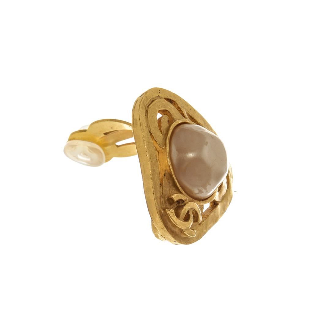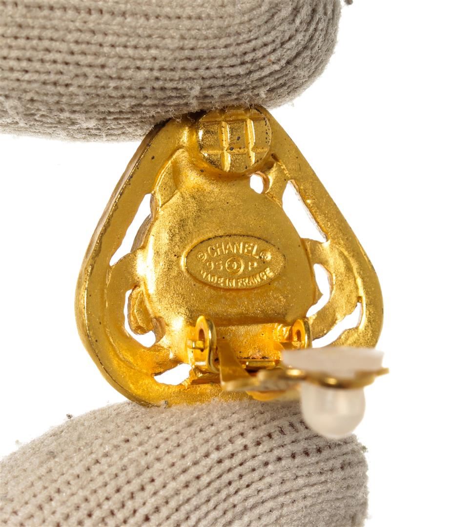 Chanel Gold Triangle Pearl Earrings. All available information is listed in the description and shown in the photos. Chanel Gold Triangle Pearl Earrings with faux pearls, gold tone metal hardware, and made in France.