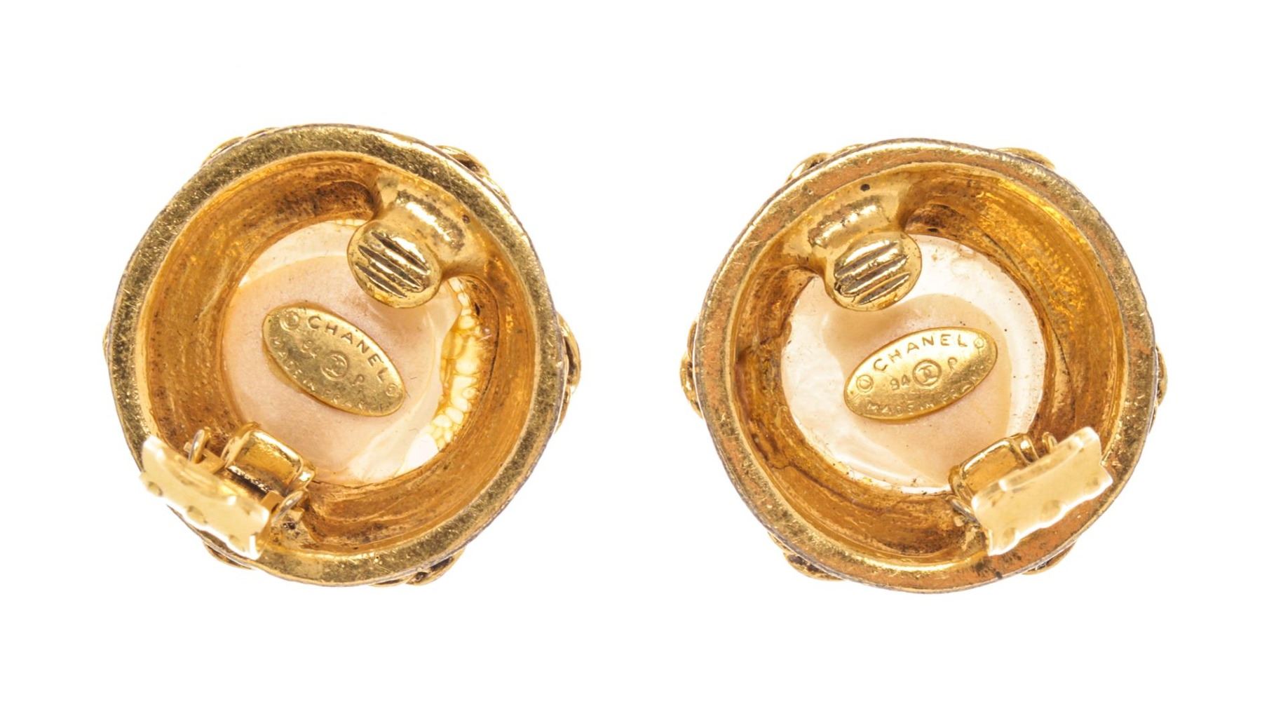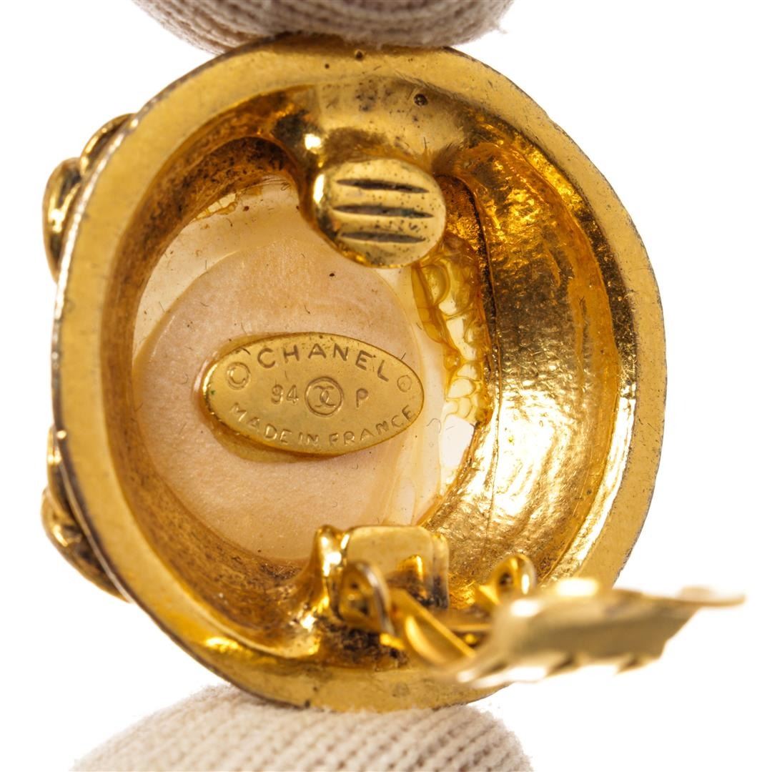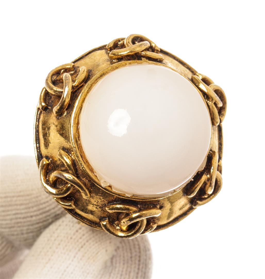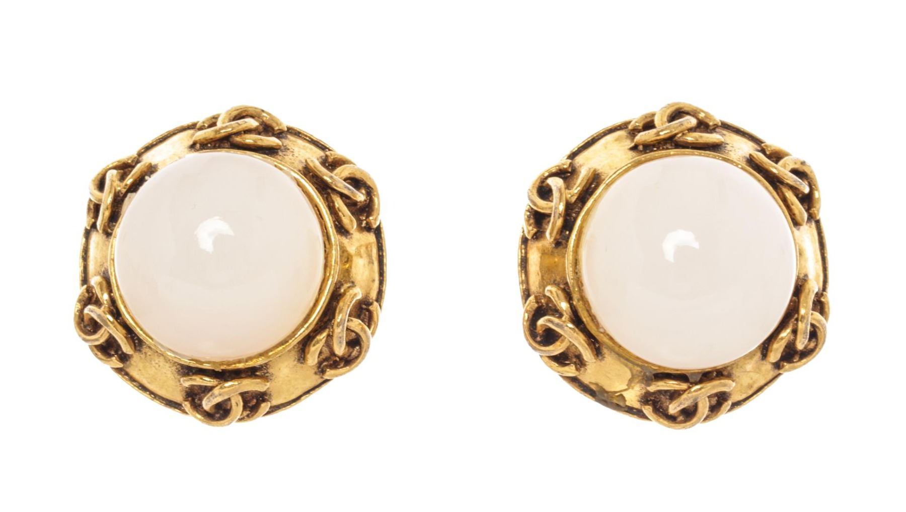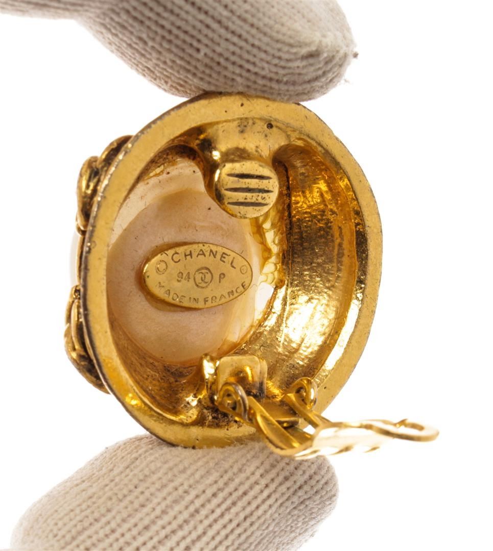 Chanel Gold and Pearl Metal CC Earrings. All available information is listed in the description and shown in the photos. Chanel Gold and Pearl Metal CC Earrings with a big pearl mounted, on the mindle surrounded by the famous double c, gold tone metal hardware with pearls, clip on closure on back.