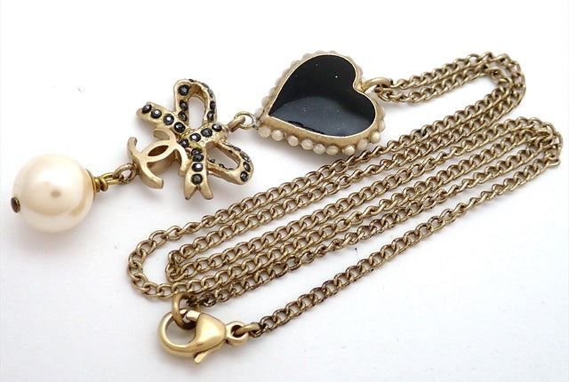 One Chanel Gold-tone Black Heart Ribbon Pendant CC Necklace. Item is sold AS-IS. All available information is listed in the description and shown in the photo. Chanel CC necklace features gold-tone hardware, black heart-shaped pendant surrounded by faux pearls, a gold-tone iron band embellised with black rhinestones and interlocking CC logo at base, a faux pearl and lobster claw closure.