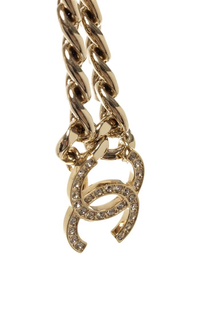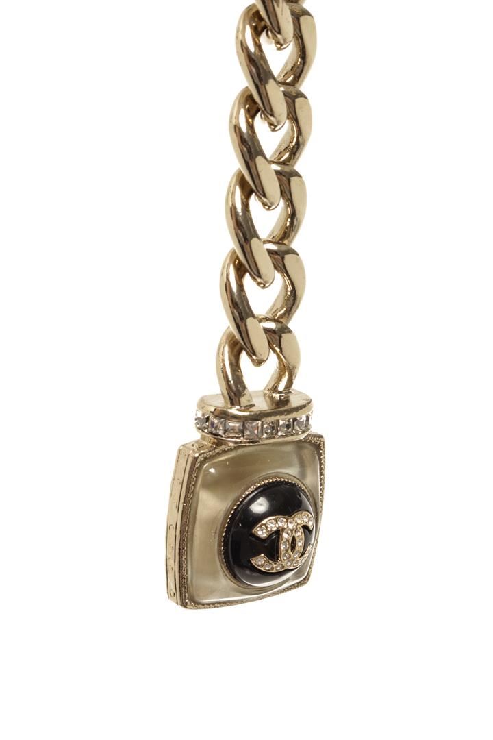One Chanel Gold-tone CC Lipstick Chain. Item is sold AS-IS. All available information is listed in the description and shown in the photo. Chanel gold-tone CC lipstick chain with a lipstick charm with a CC logo and rhinestones on it on one end, a rhinestone CC logo in a square on the other end, and a CC rhinestone logo in the middle.