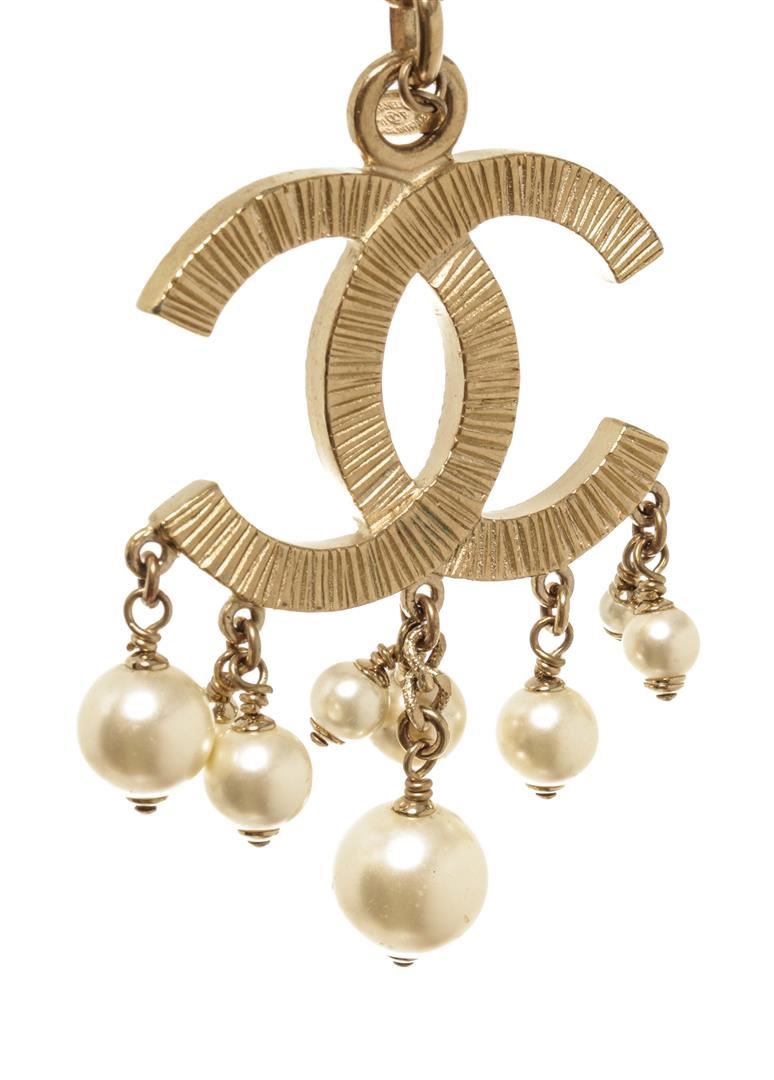 Chanel Gold-tone CC Logo Pearl Key Chain. All available information is listed in the description and shown in the photos. Chanel Gold-tone CC Logo Pearl Key Chain with chanel cc key chain is crafted in light gold-tone hardware and features interlocking cc etched logo with beautiful white faux pearls of various sizes.