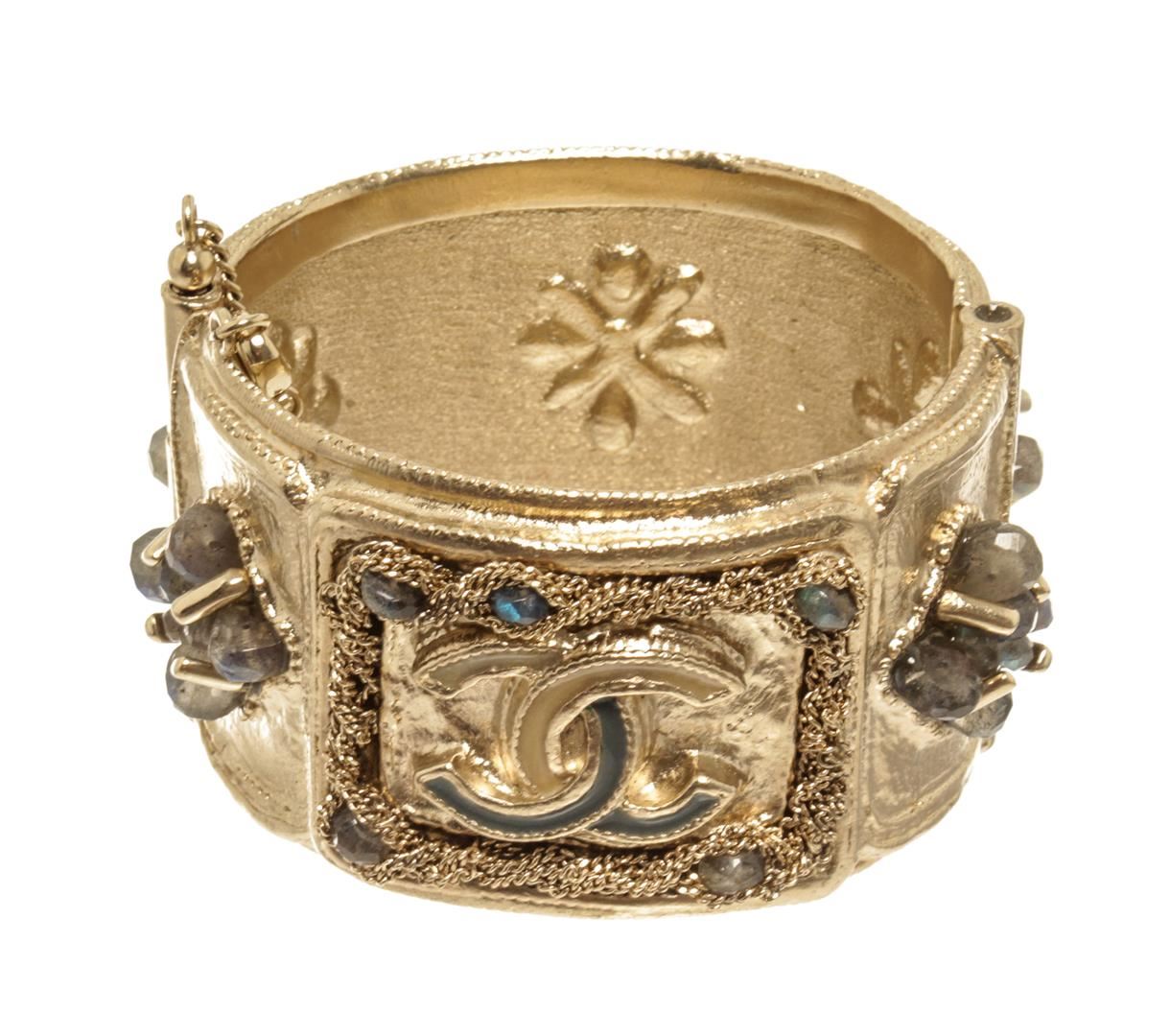 One Chanel Gold-tone Calfskin & Labradorite CC Wide Cuff Bangle. Item is sold AS-IS. All available information is listed in the description and shown in the photo. Chanel Gold-tone Calfskin & Labradorite CC Wide Cuff Bangle