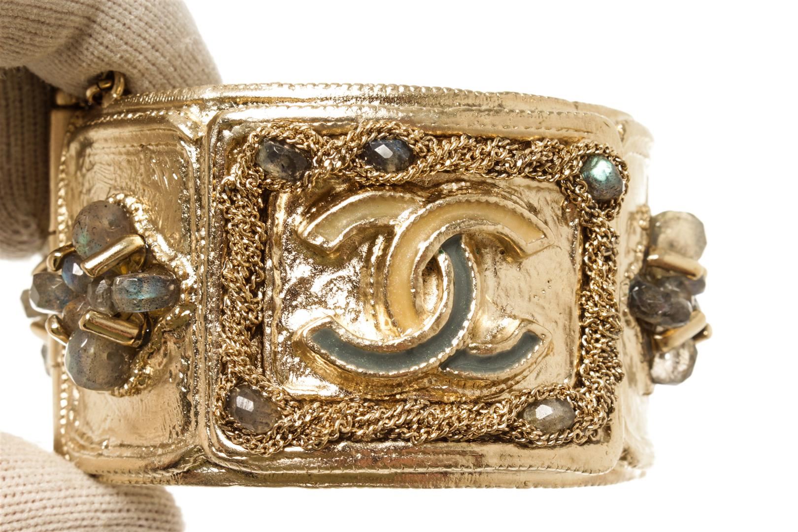 One Chanel Gold-tone Calfskin & Labradorite CC Wide Cuff Bangle. Item is sold AS-IS. All available information is listed in the description and shown in the photo. Chanel Gold-tone Calfskin & Labradorite CC Wide Cuff Bangle