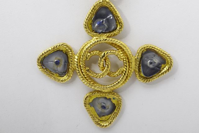 Chanel necklace features gold-tone hardware, textured chain-link and black faux pearl embellishments, a pendant with round interlocking CC cutout logo at the center surrounded by lab-created crystals and a spring ring closure.