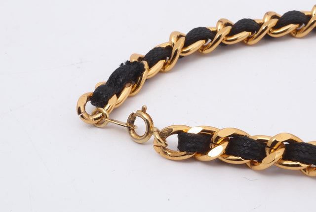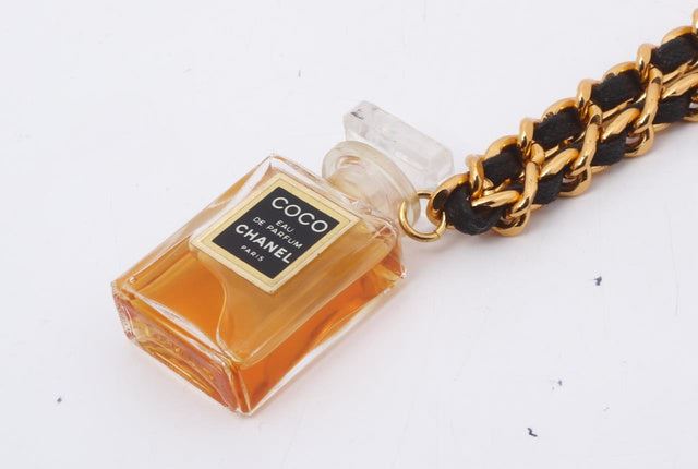 Chanel Necklace features gold-tone chain entwined with black leather, a small Chanel Eau De Parfum bottle pendant and small spring ring closure.