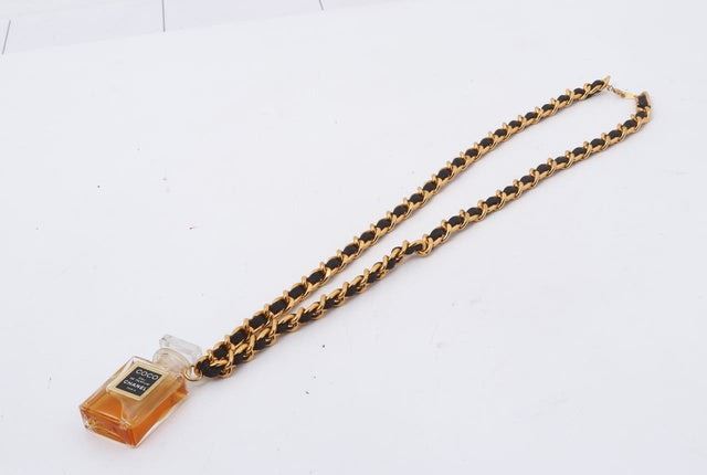 One Chanel Gold-tone Eau De Parfum Bottle Charm Necklace. Item is sold AS-IS. All available information is listed in the description and shown in the photo. Chanel Necklace features gold-tone chain entwined with black leather, a small Chanel Eau De Parfum bottle pendant and small spring ring closure.