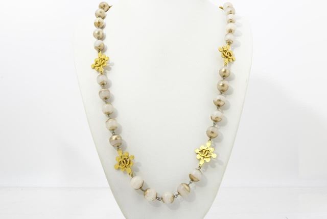 This Chanel CC logo necklace features gold-tone hardware, beige and gold beads, interlocking CC logo and spring ring closure.