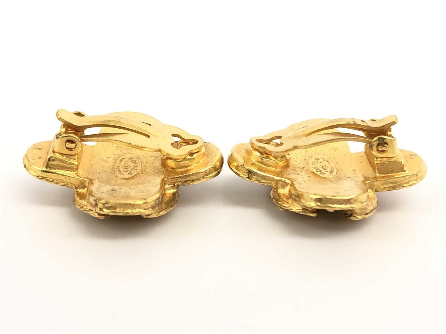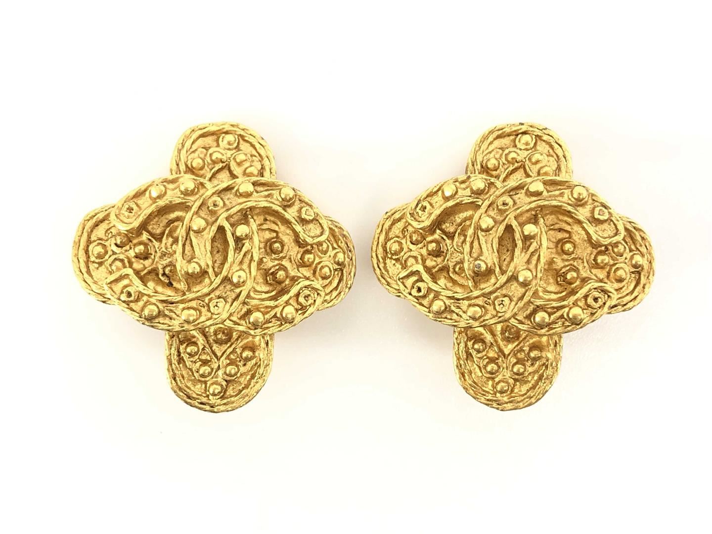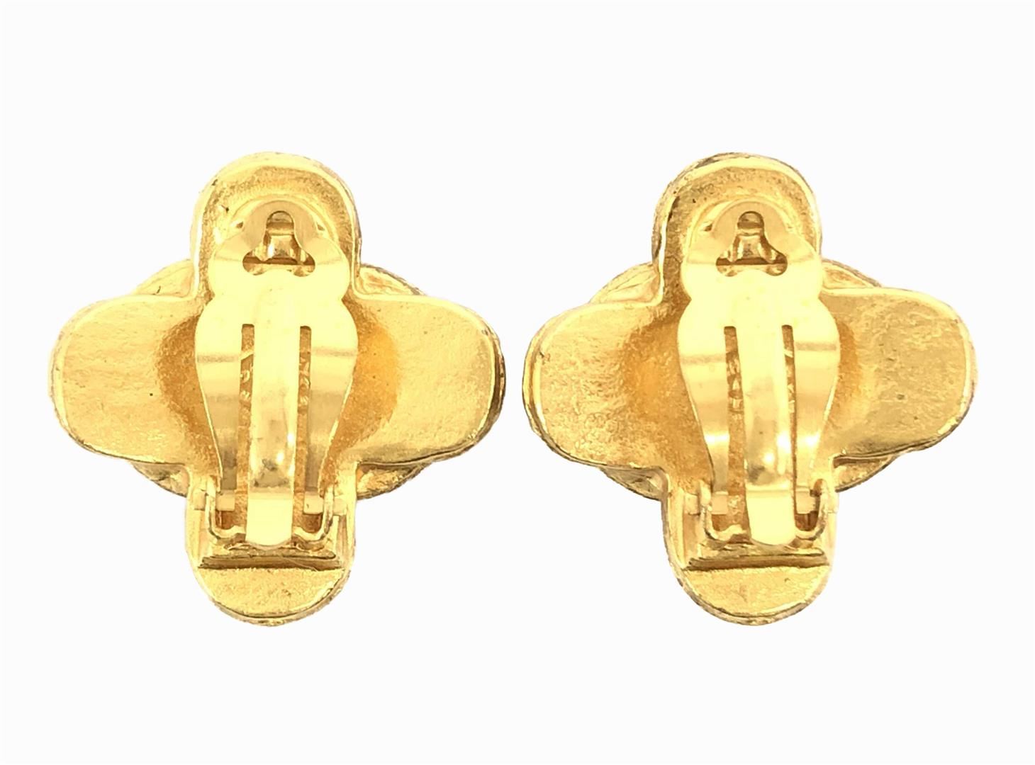 One Chanel Gold-tone Metal CC Arabesque Logo Cross Shape Clip-on Earrings. Item is sold AS-IS. All available information is listed in the description and shown in the photo. Chanel CC earrings feature gold-tone hardware, cross-shaped front part with interlocking CC logo surrounded by Arabesque accent and clip-on closures.