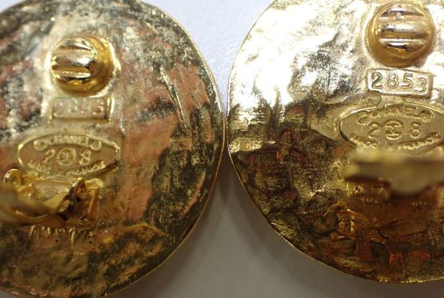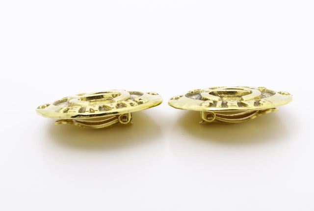 One Chanel Gold-tone Metal CC Logo Round Clip-on Earrings. Item is sold AS-IS. All available information is listed in the description and shown in the photo. Chanel CC earrings feature gold-tone hardware, a round front with interlocking CC logo at the center and surrounded by CHANEL PARIS logo and clip-on closures.