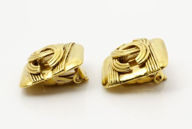 Chanel Gold-tone Metal CC Logo Square Clip-on Earrings. All available information is listed in the description and shown in the photos. Chanel CC earrings features gold-tone hardware, square front with interlocking CC logo at center & additional textured motif at back and clip-on closures.