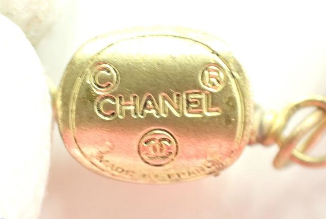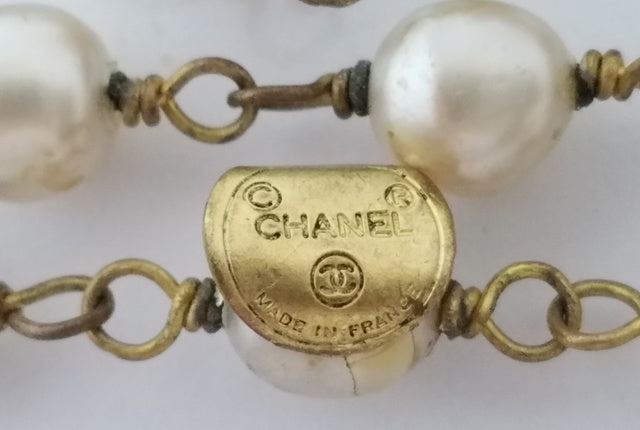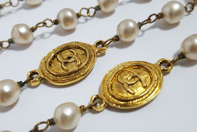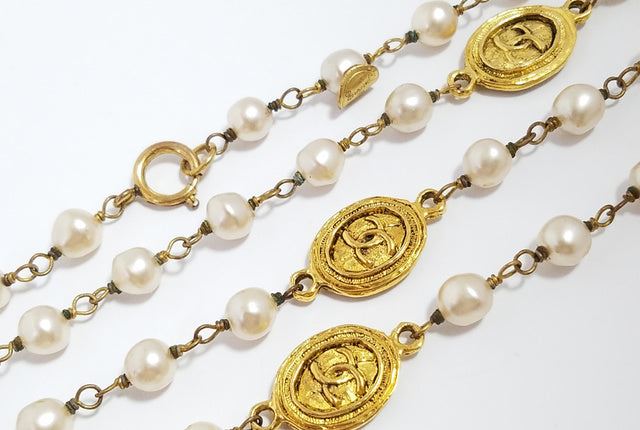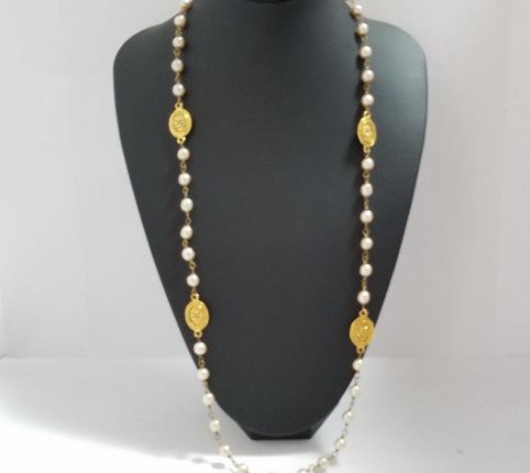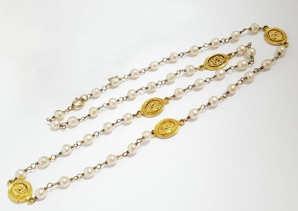 Chanel CC long necklace features gold-tone hardware, faux pearls embellishment, four gold-tone oval medallions with interlocking CC logo accent at the center and a spring ring closure.