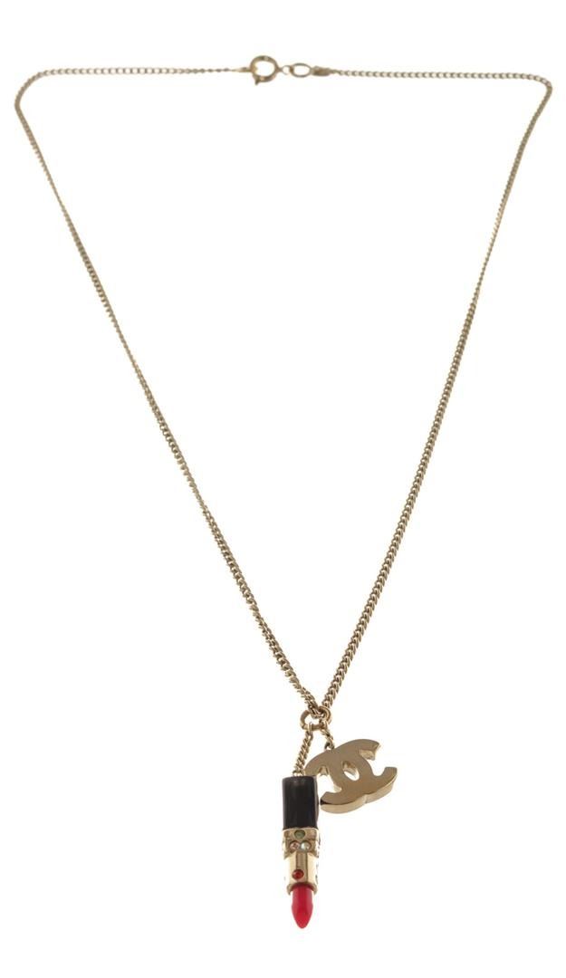 Chanel Gold-tone Metal Jeweled Lipstick CC Logo Pendant Necklace. All available information is listed in the description and shown in the photos. Chanel CC necklace features gold-tone metal, two small charms attached by chain to a jump ring - a red rhinestone encrusted lipstick & gold-tone CC logo, complete with spring-ring closure.