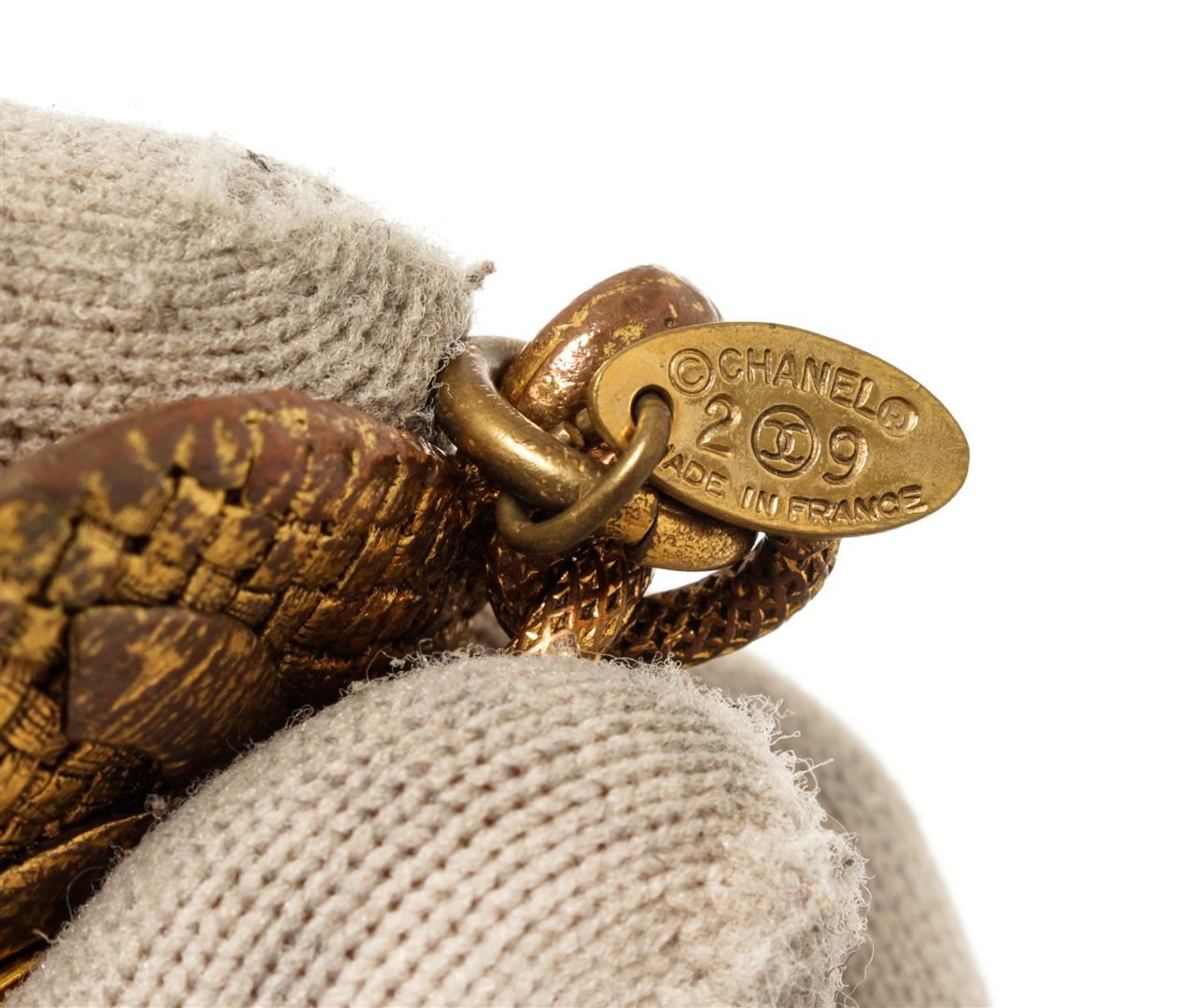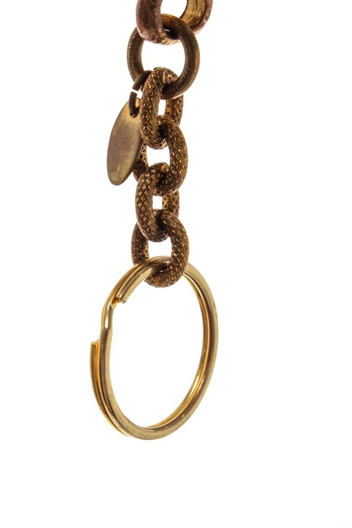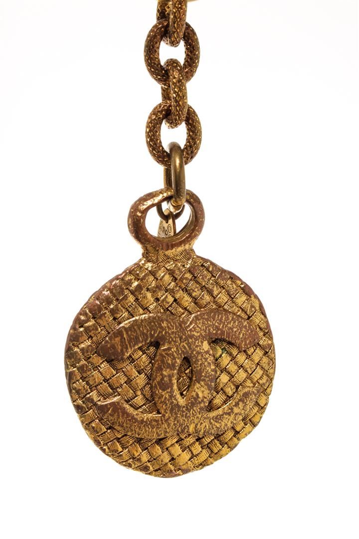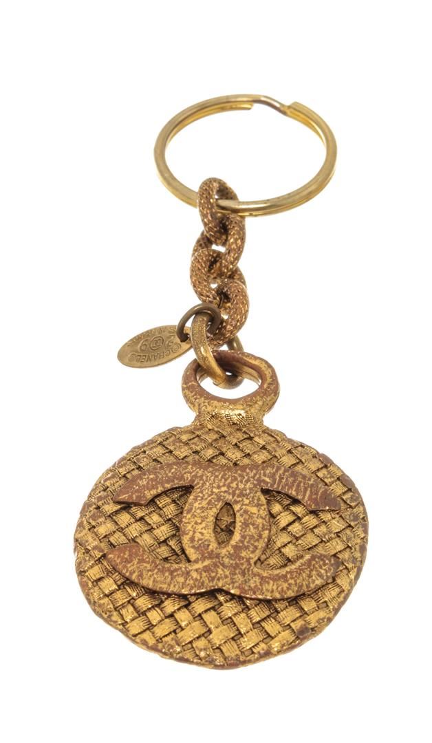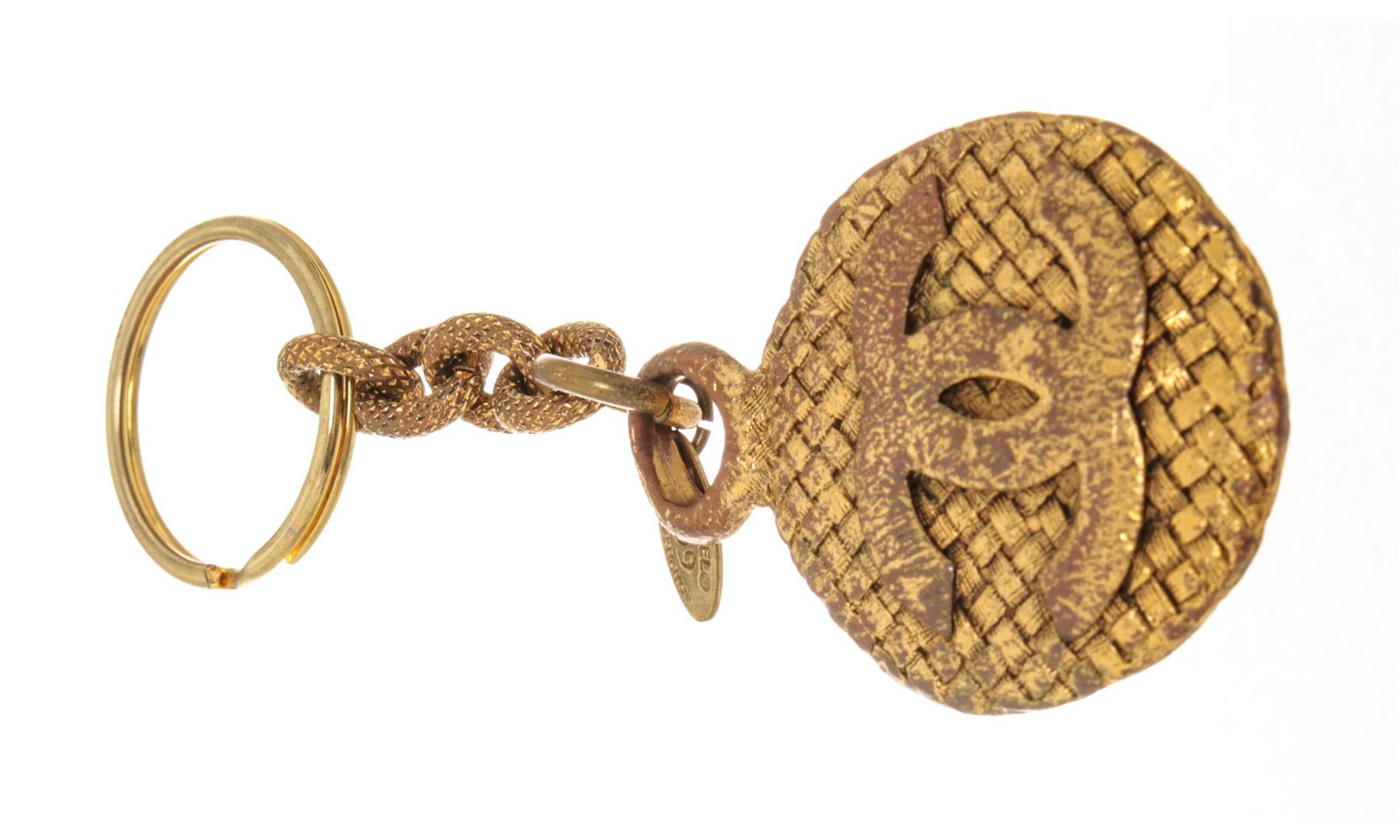 One Chanel Gold-tone Metal Keyholder. Item is sold AS-IS. All available information is listed in the description and shown in the photo. Chanel gold-tone metal keyholder with CC logo coin with a weaved pattern on a keychain.