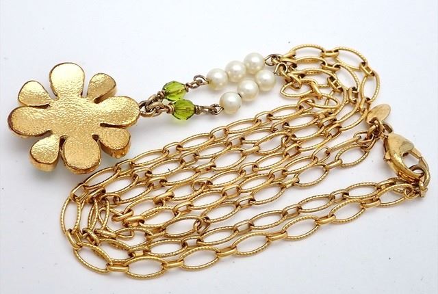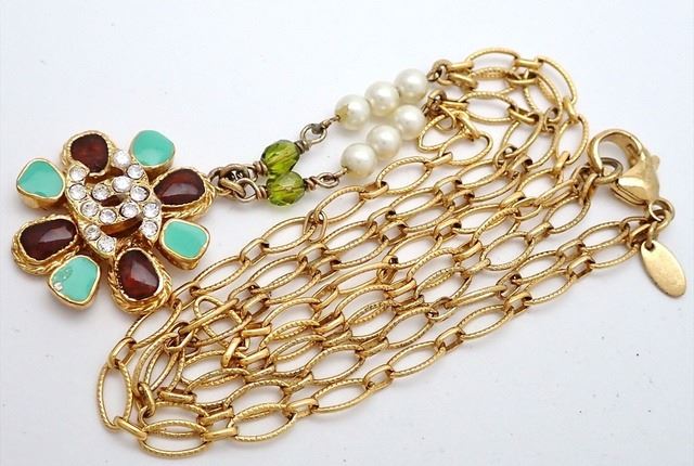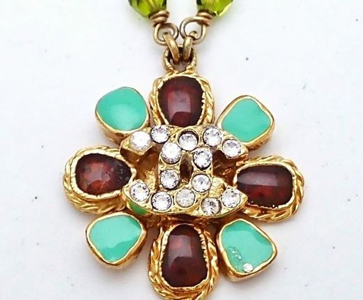 Chanel CC Gripoix necklace features gold-tone metal hardware, an interlocking CC logo adorned with clear rhinestones and surrounded by multicolor lab-created stones, faux white pearl embellishment on chain and lobster clasp closure.