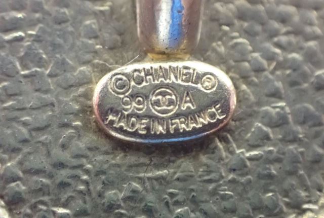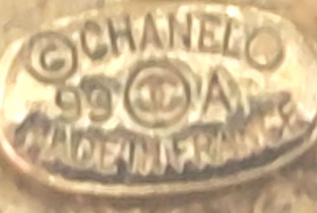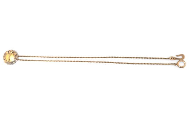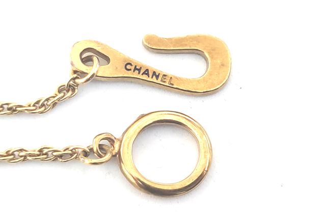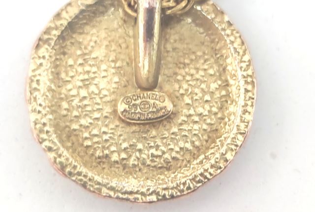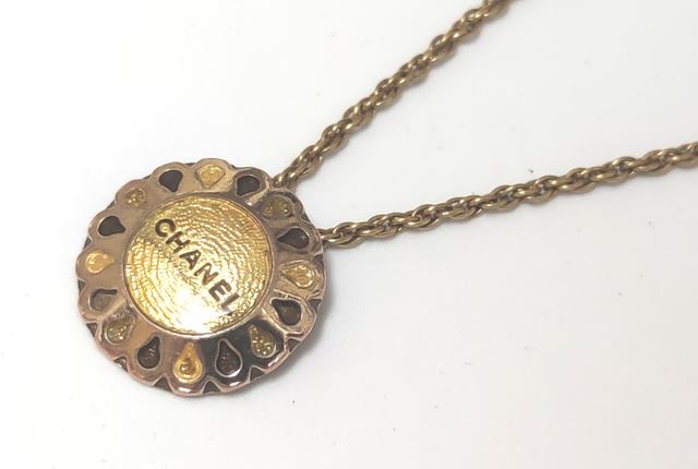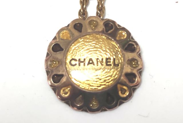 Chanel necklace features gold-tone hardware, a round pendant with CHANEL logo engraving at center, long chain and hook closure.