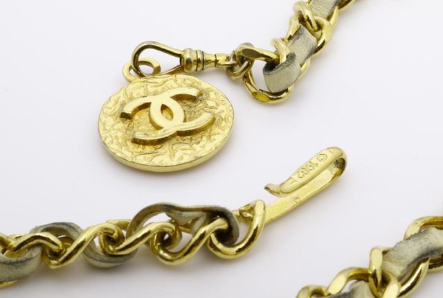 Chanel Gold-tone Metal Woven Chain and Beige Leather CC Charm Belt SLG. Brand: Chanel, Style: Gold-tone Metal Woven Chain and Beige Leather CC Charm Belt, Type: SLG, Exterior color: Gold, Exterior material: Metal, Length: 29.5", Width: 0.25". Item is sold